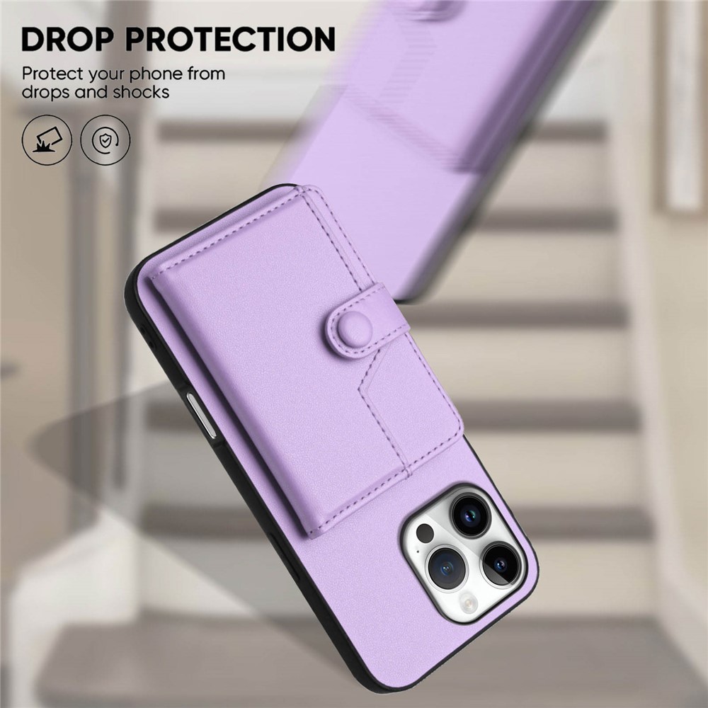 For iPhone 16 Pro Case RFID Blocking Card Holder Kickstand TPU + PU Leather Phone Back Cover – Purple