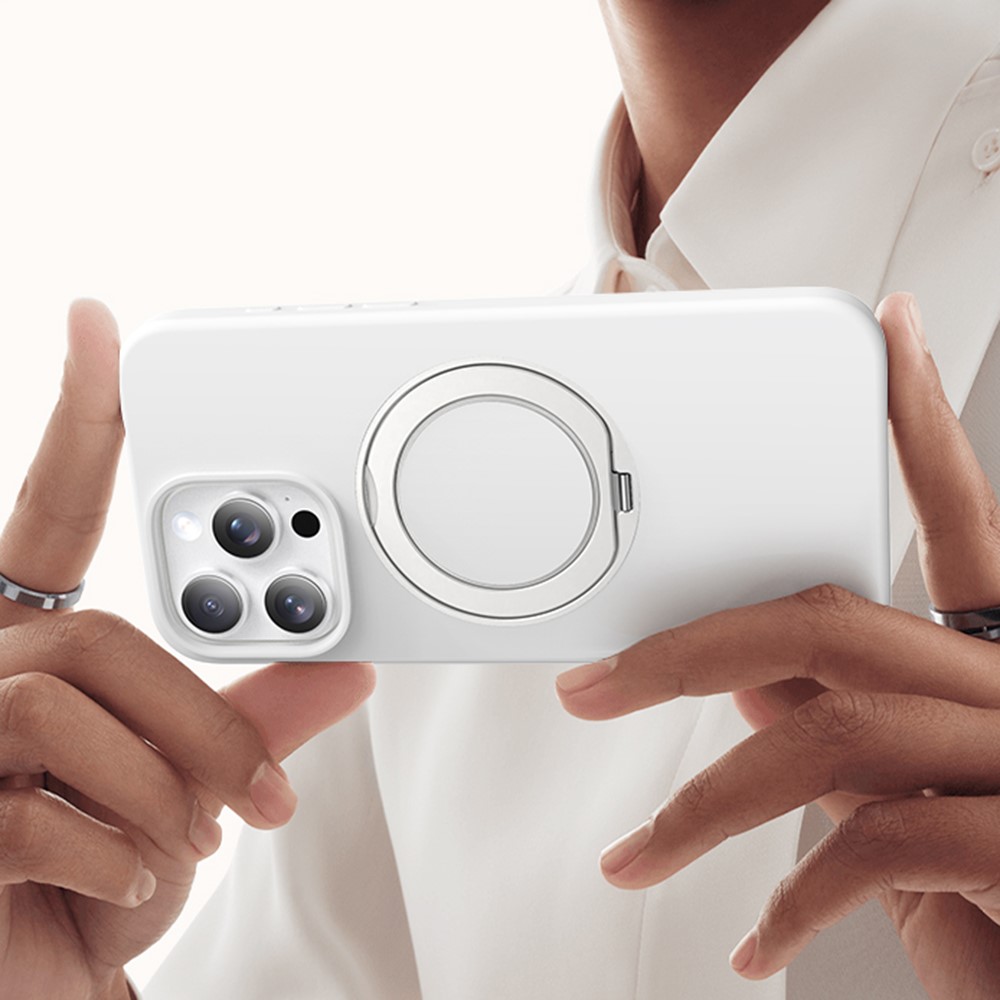 • 360° Rotating Kickstand The Integrated ring kickstand rotates freely and lies completely flush with the case when not in use. Offers a comfortable grip and supports hands-free viewing in both portrait and landscape modes
