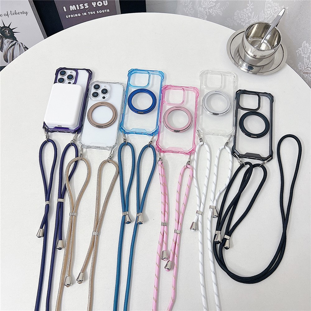 • For iPhone 16 Pro Magnetic Case Ring Kickstand TPU + PC Phone Cover with Lanyard - Transparent