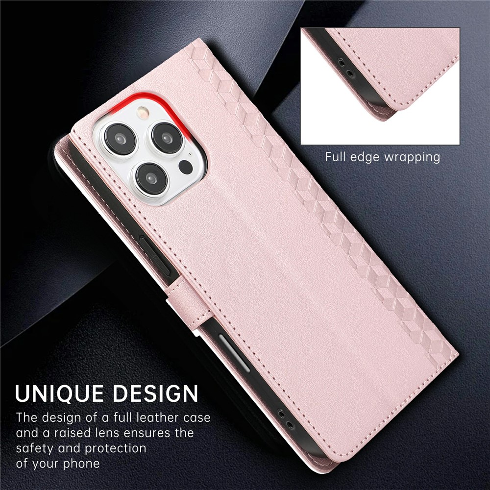 - Stylish 3D Rhombus Grid Design & Premium Material Features a 3D rhombus grid imprinted pattern, crafted from high-quality PU leather and durable TPU, combining luxurious feel with long-lasting durability