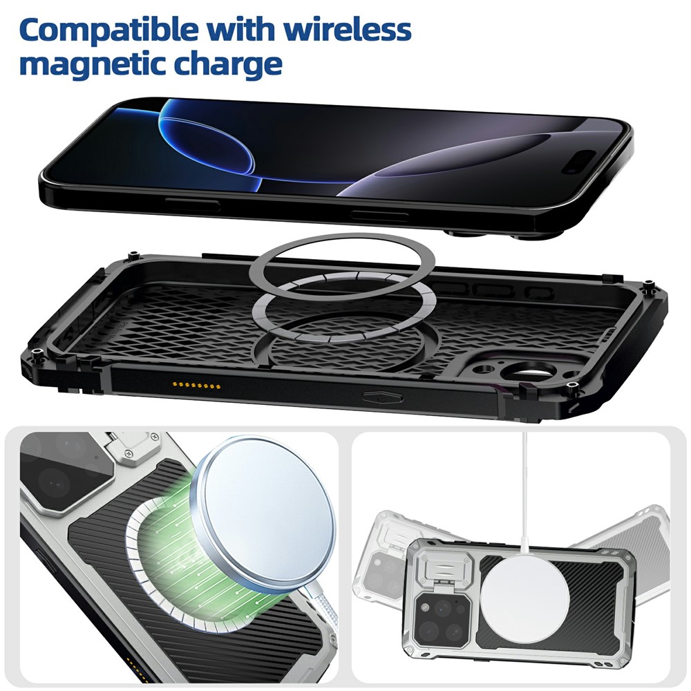 • For iPhone 16 Pro Max Case Aluminum Alloy + Silicone Lens Kickstand Phone Cover with Tempered Glass Film - Black