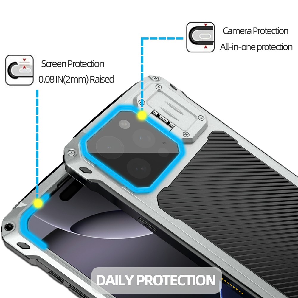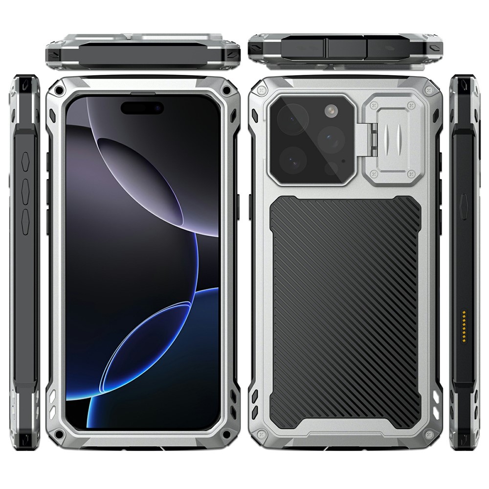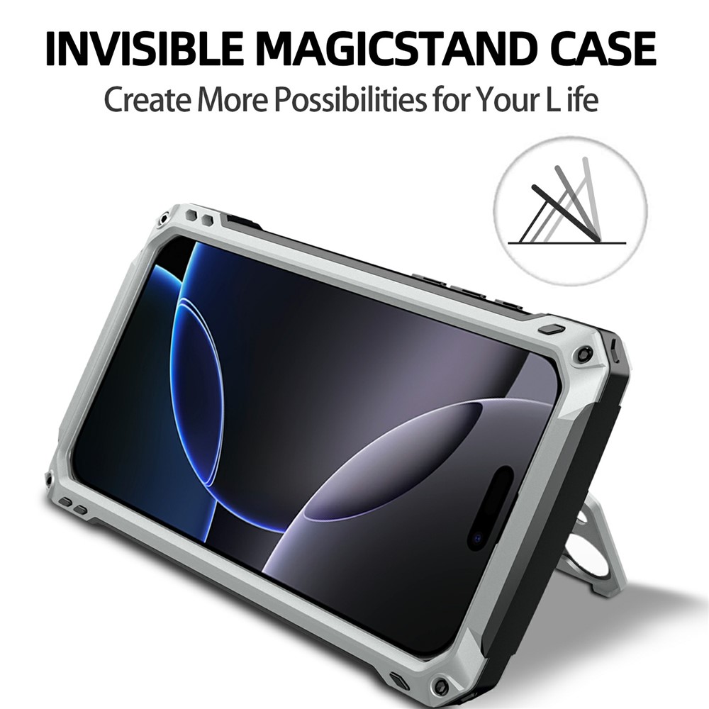 For iPhone 16 Pro Max Case Aluminum Alloy + Silicone Lens Kickstand Phone Cover with Tempered Glass Film – Silver
