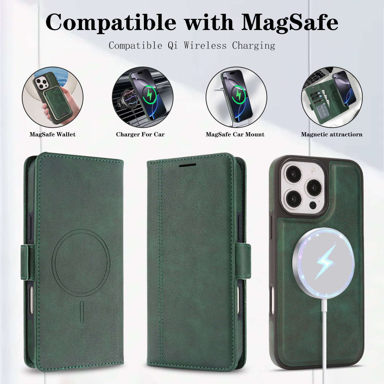 For iPhone 16 Pro Max Case Detachable 2 in 1 Leather Wallet Phone Cover Compatible with MagSafe – Green