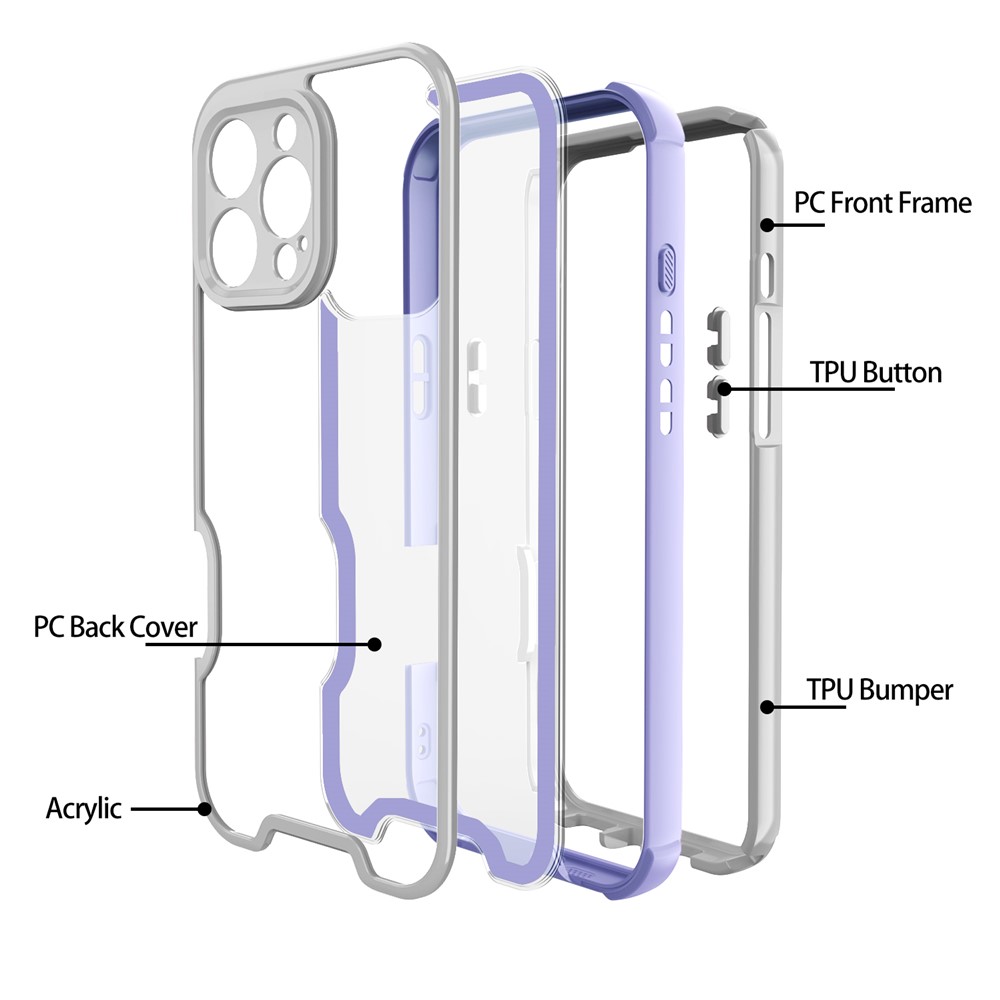 - 4-in-1 Detachable Design Features a modular structure including a PC front frame, acrylic back panel, TPU bumper, and reinforced TPU buttons for easy installation and full-body protection