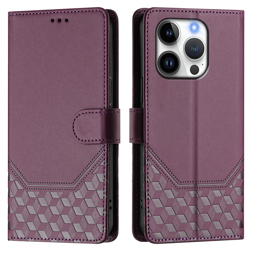 • For iPhone 16 Pro Max Case Imprinted Honeycomb RFID Blocking Leather Phone Cover with Strap - Light Purple