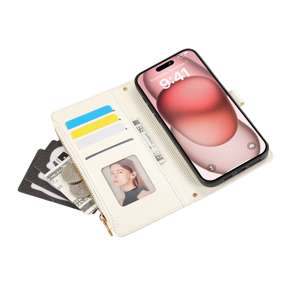 For iPhone 16 Pro Max Case Multi Card Slots Zipper Rhombus Leather Phone Cover with Wrist Strap - Beige $18.10