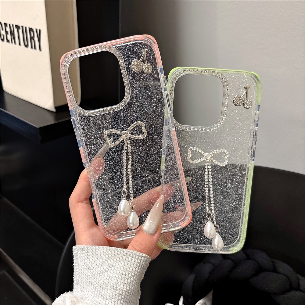 - Bow & Pearl Tassel Charm Decorated with a rhinestone cherry, bow and hanging pearl tassels for an elegant, feminine touch