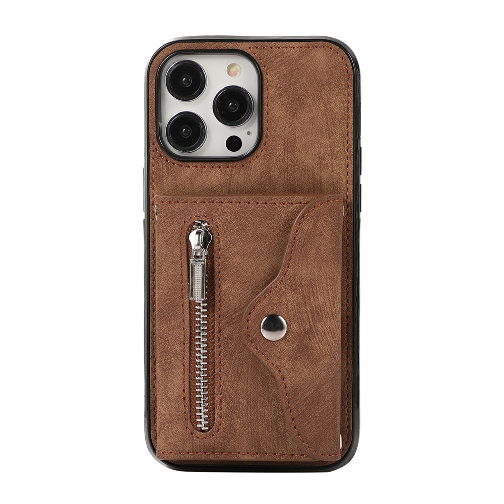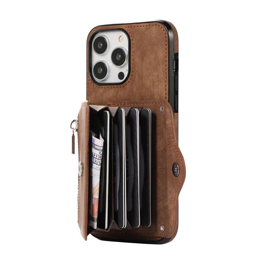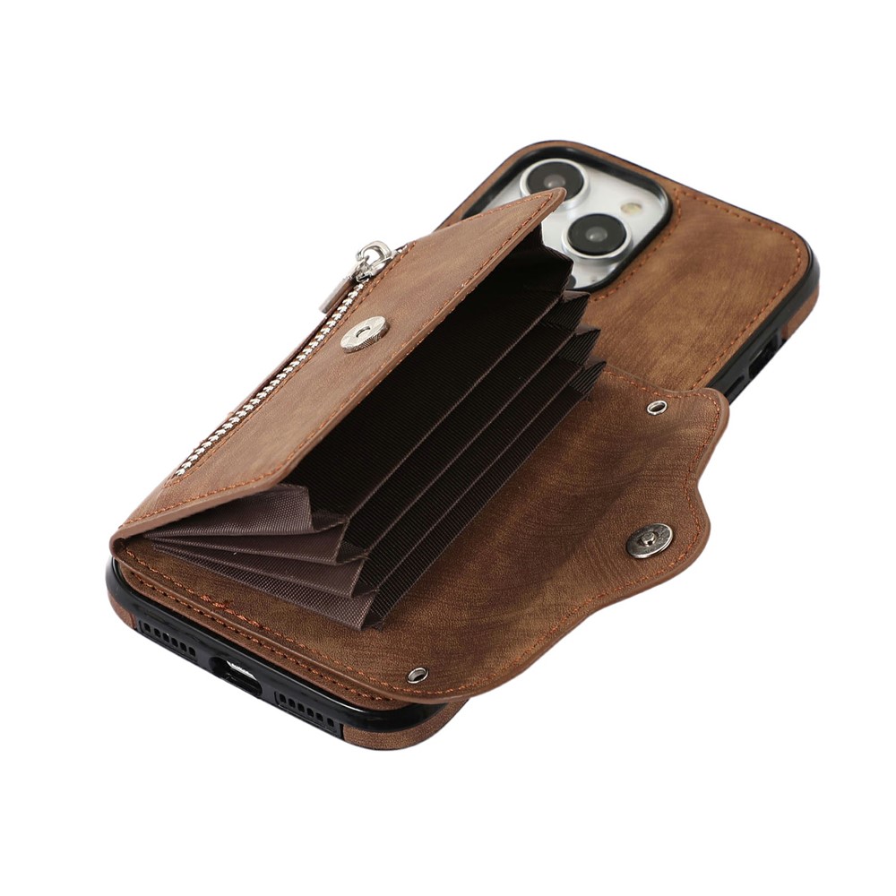 - Card Holder Design Features a multi-slot accordion-style card holder with a zipper and snap button closure, providing organized storage for cards, cash, and coins