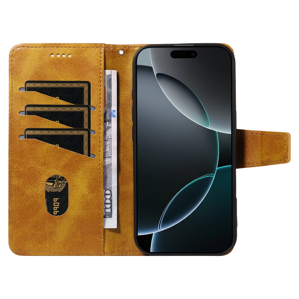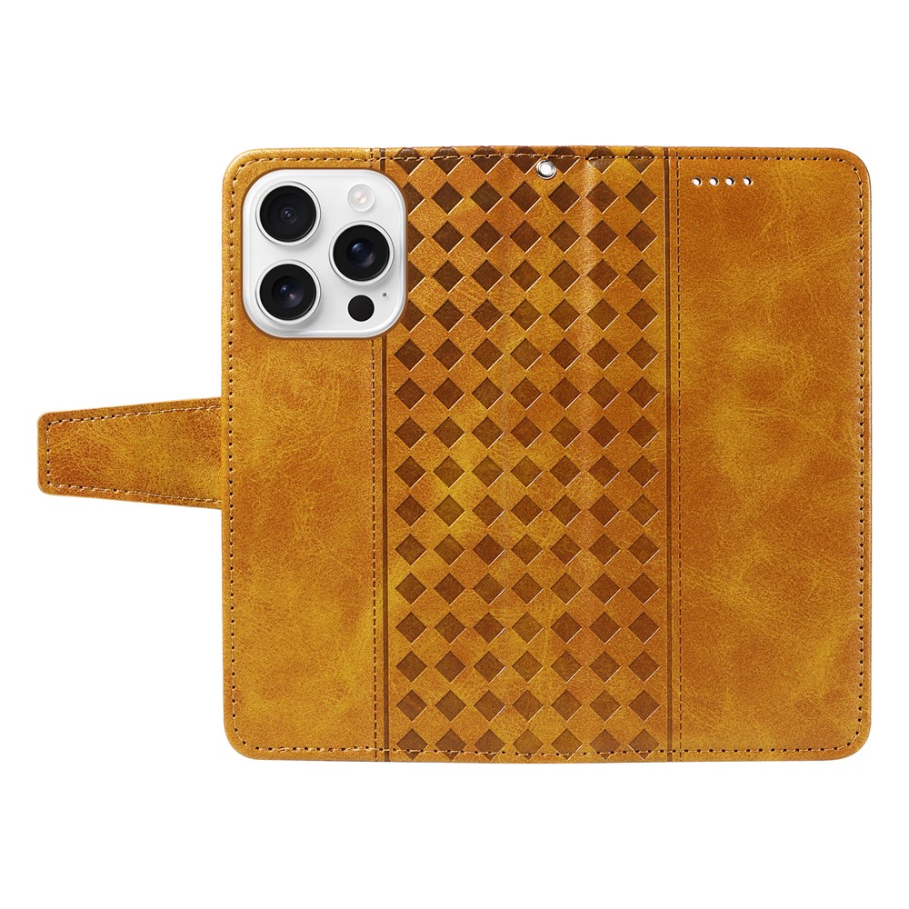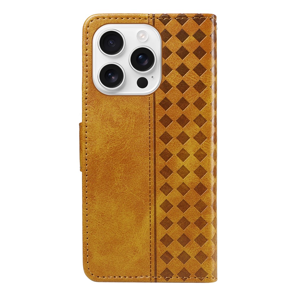 For iPhone 16 Pro Max Leather Case Wallet Stand Grids Imprinted Phone Cover with Strap - Yellow $15.71