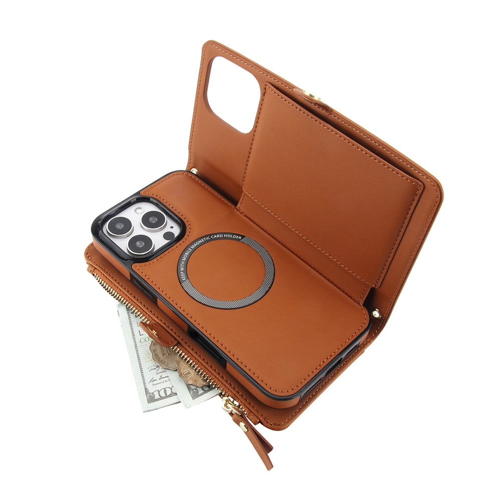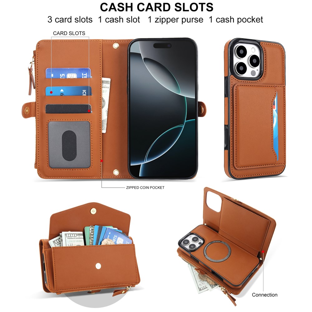 - Wallet Design Features a built-in wallet with 3 card slots, a cash slot, a zipper purse and a cash pocket, allowing you to carry your essentials with ease