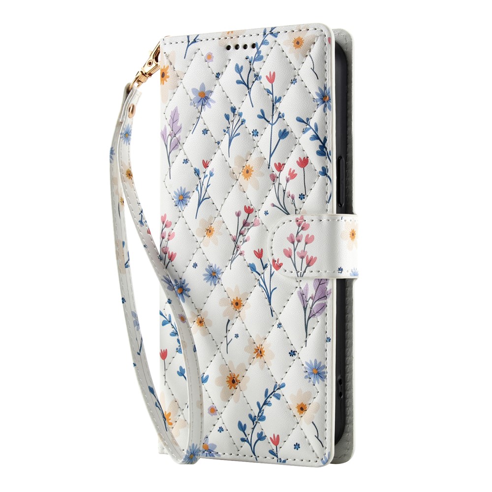 • For iPhone 16 Pro Max Wallet Case Rhombic Floral Design Leather Flip Phone Cover with Strap - A5