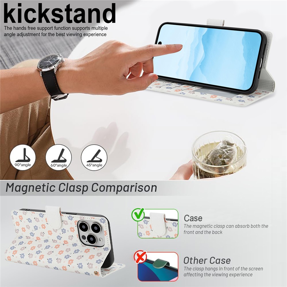 • For iPhone 16 Pro Max Wallet Case Rhombic Floral Design Leather Flip Phone Cover with Strap - A1