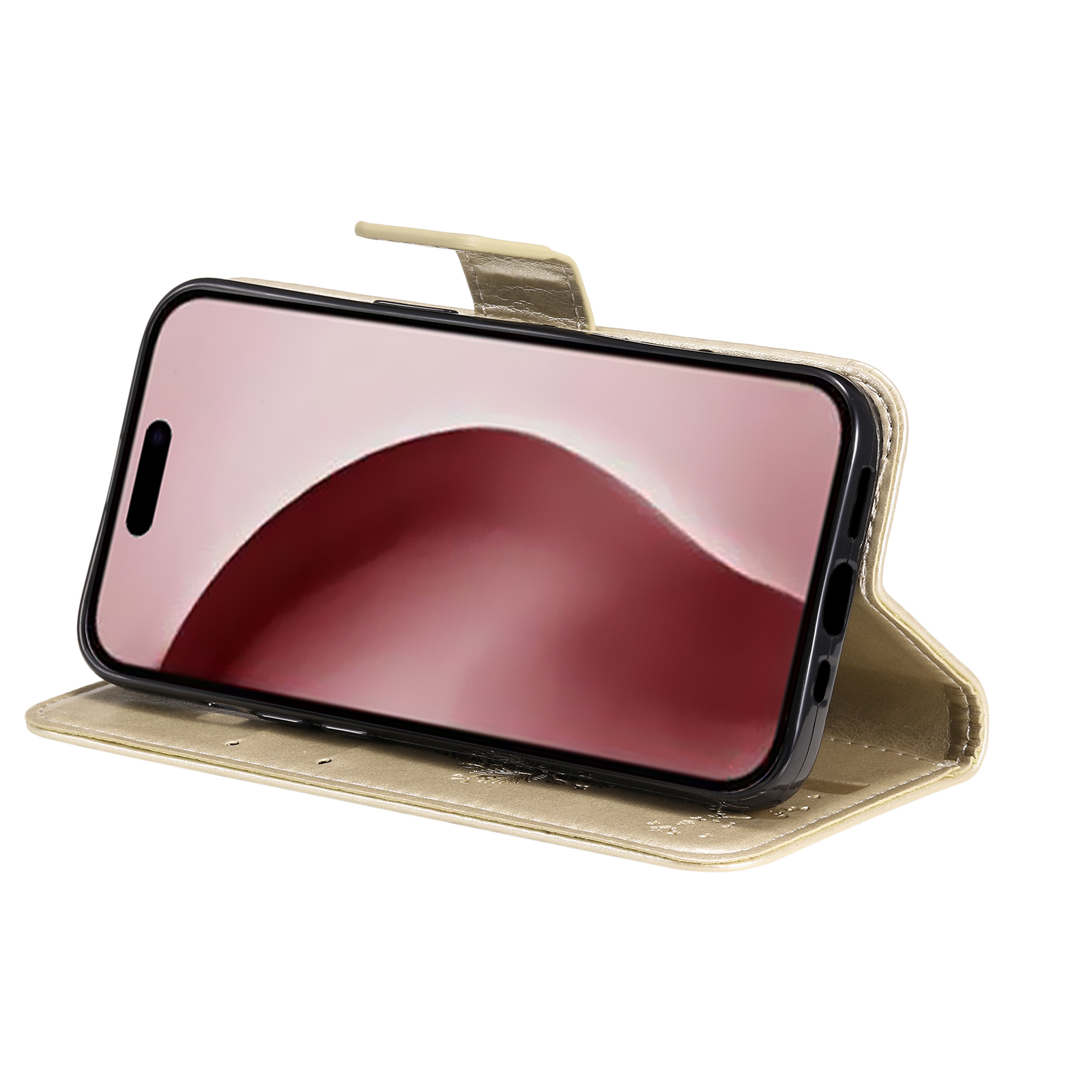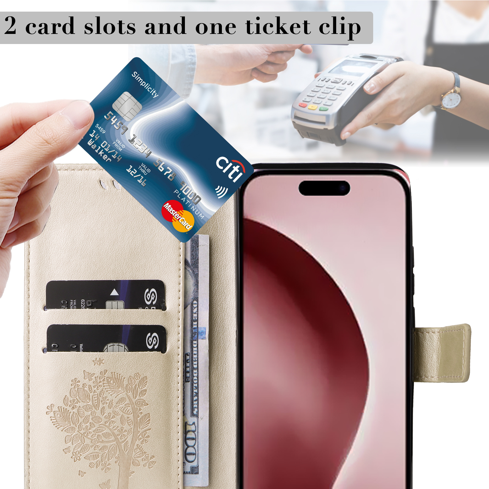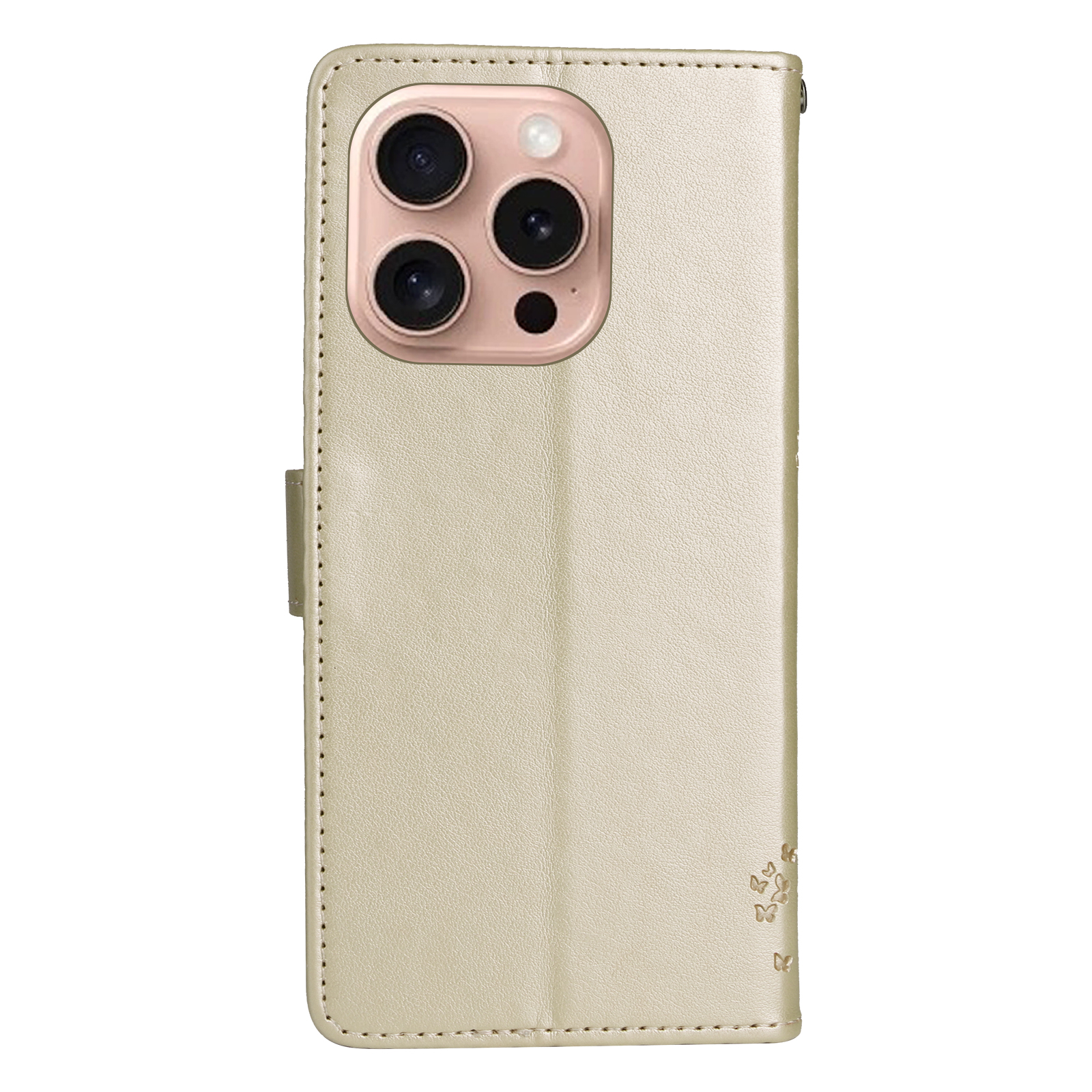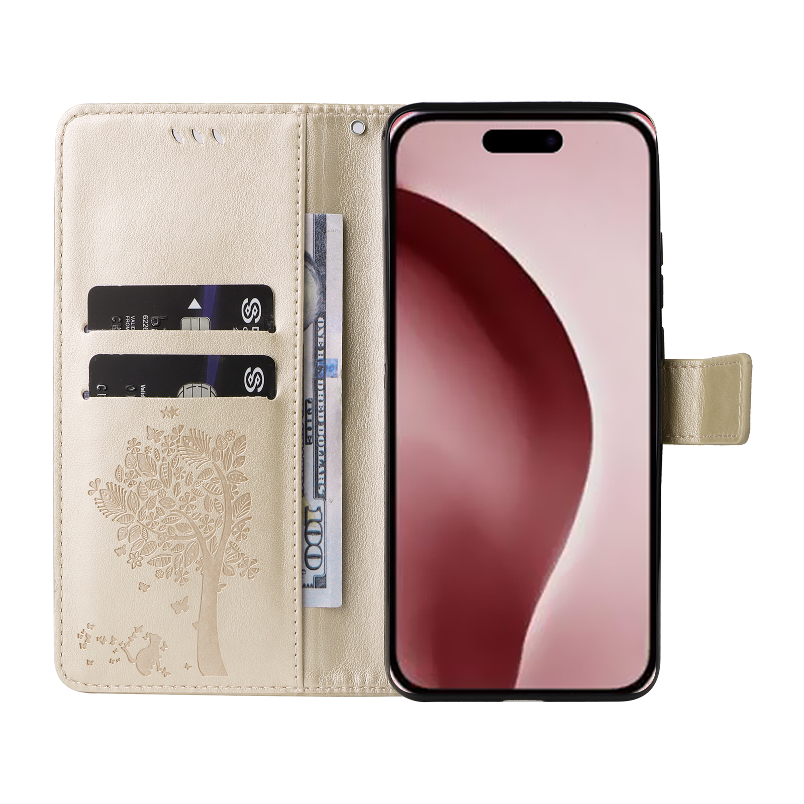 For iPhone 16 Pro Phone Case with Stand Cat Tree Pattern Leather Wallet Mobile Cover – Gold
