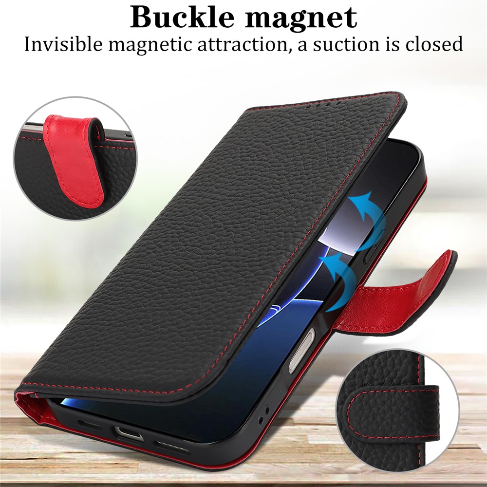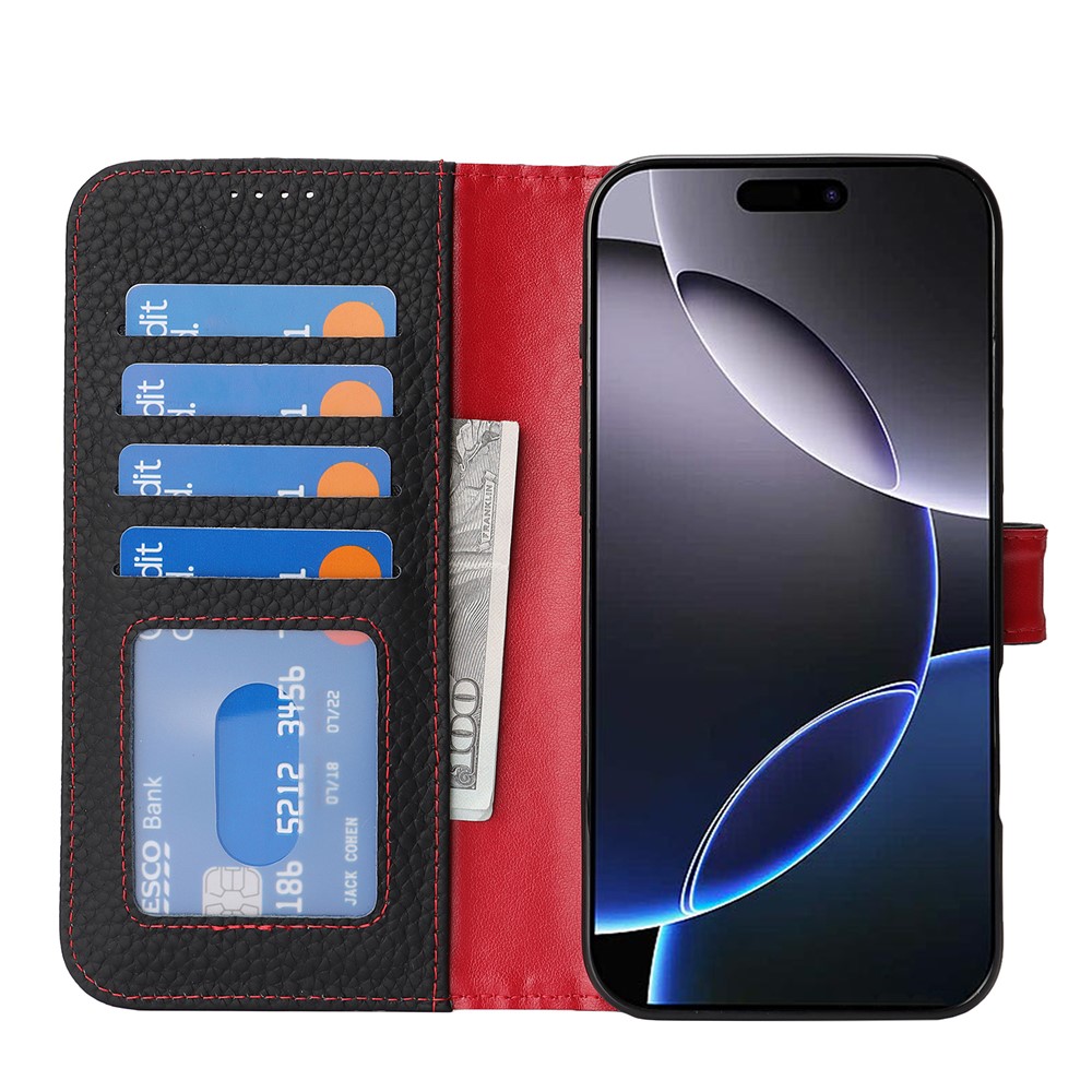 For iPhone 16 Pro Stand Case Litchi Texture Genuine Cow Leather Wallet Phone Cover RFID Blocking - Black / Red $24.02