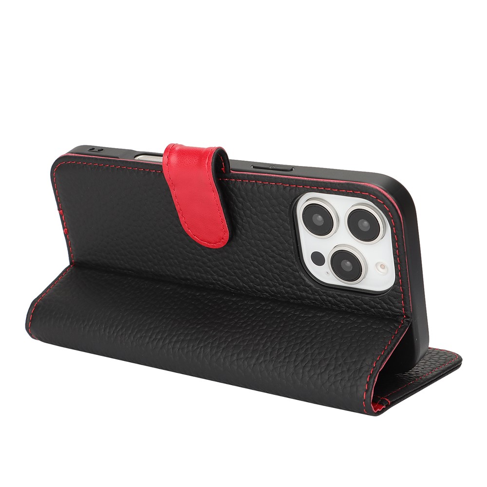 For iPhone 16 Pro Stand Case Litchi Texture Genuine Cow Leather Wallet Phone Cover RFID Blocking - Black / Red