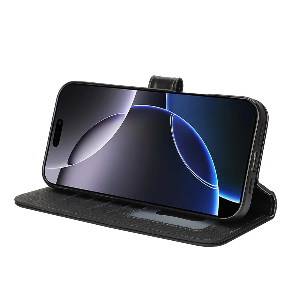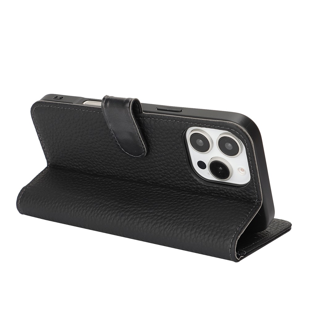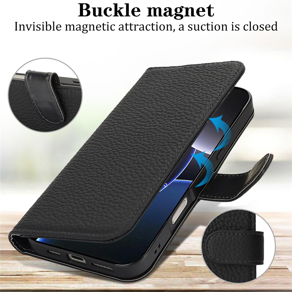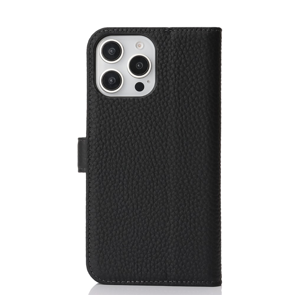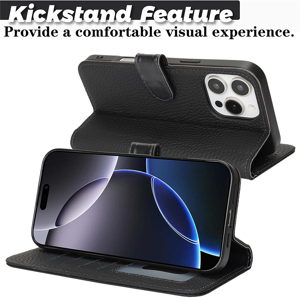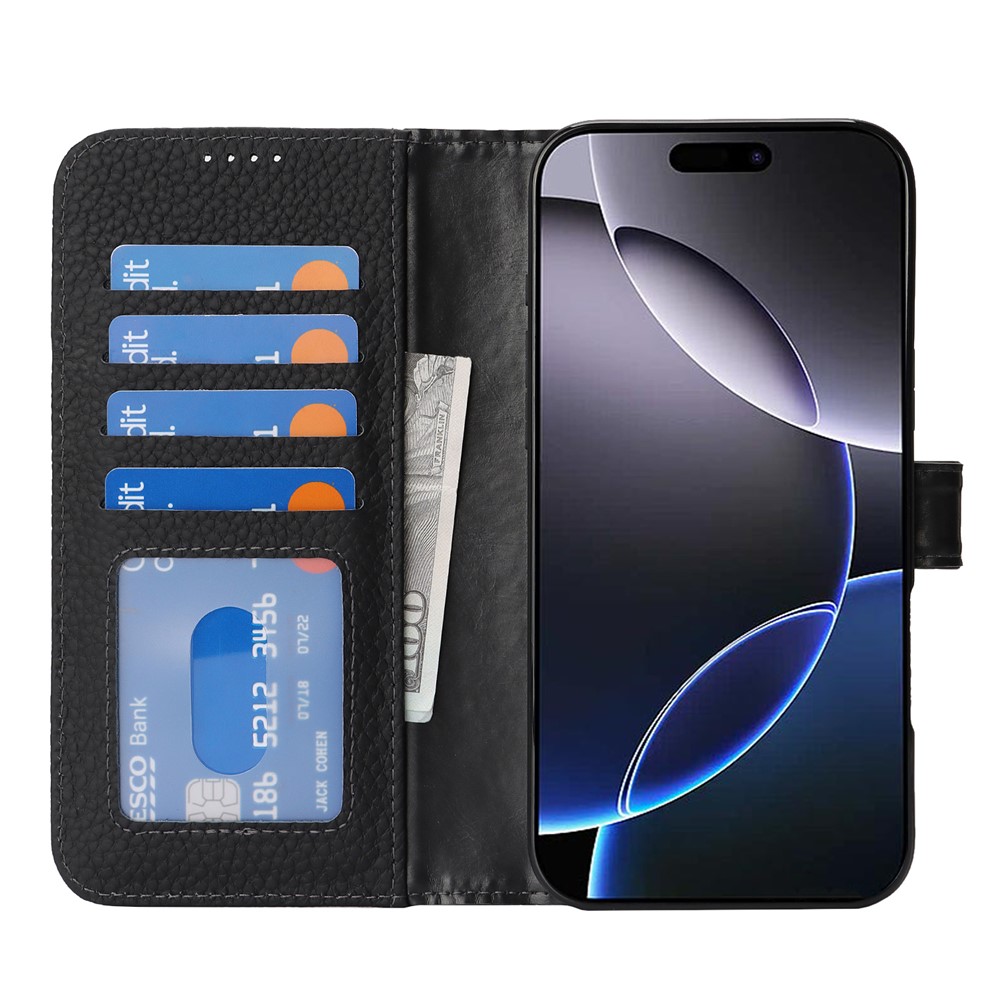 For iPhone 16 Pro Stand Case Litchi Texture Genuine Cow Leather Wallet Phone Cover RFID Blocking – Black