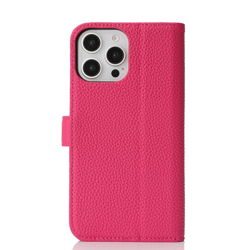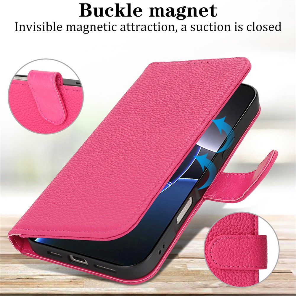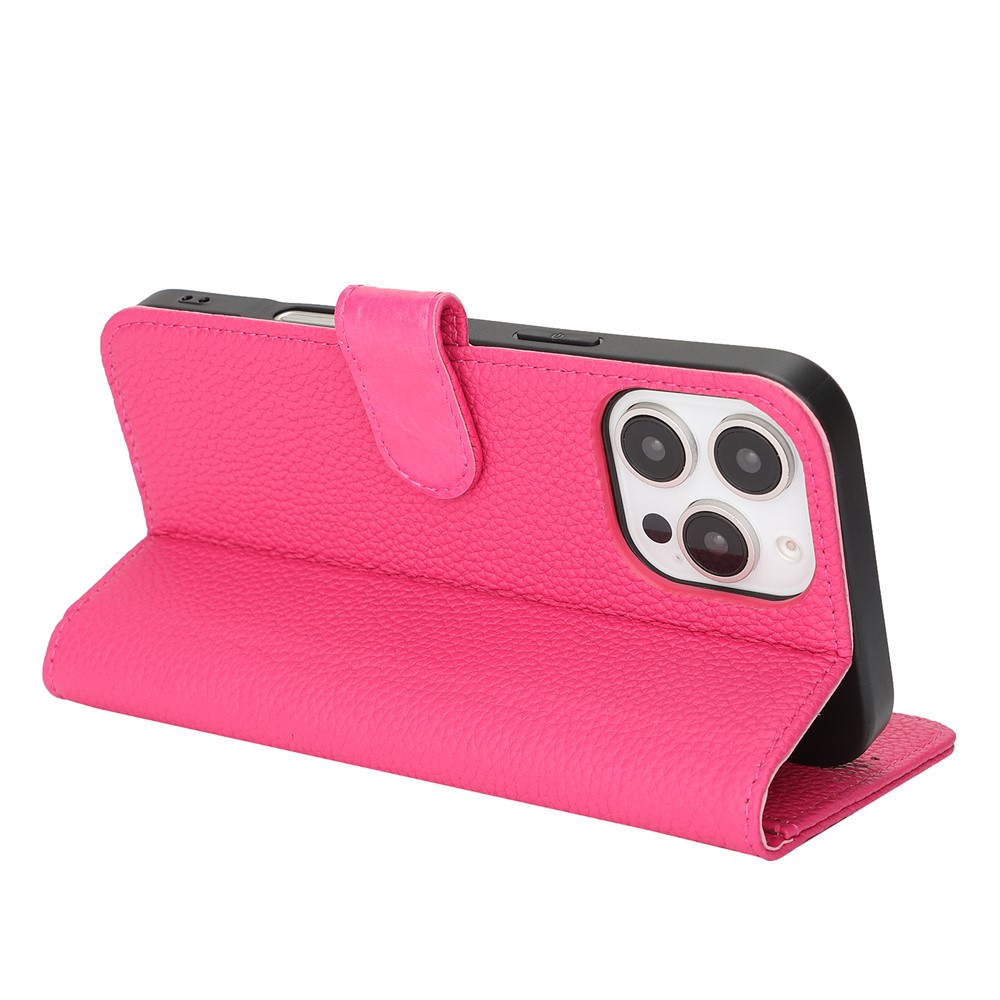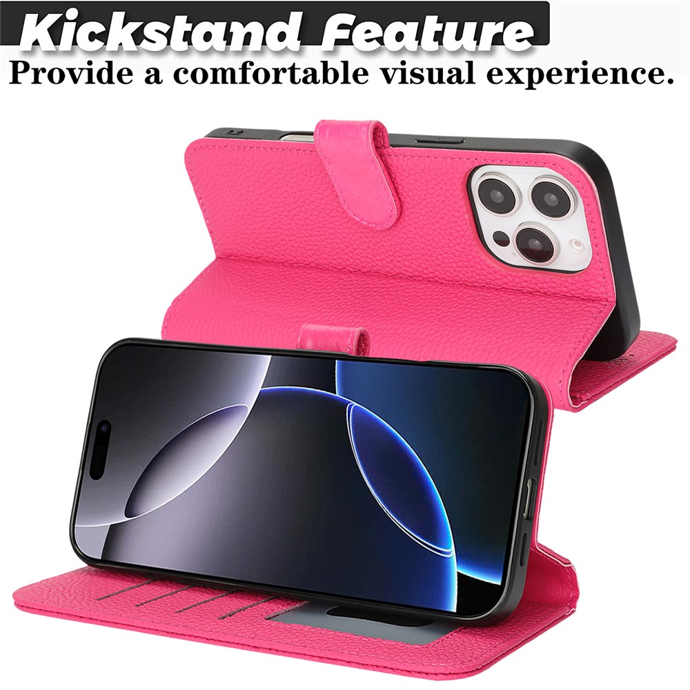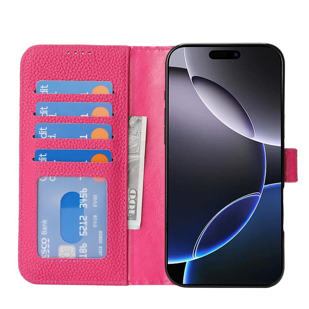For iPhone 16 Pro Stand Case Litchi Texture Genuine Cow Leather Wallet Phone Cover RFID Blocking – Rose