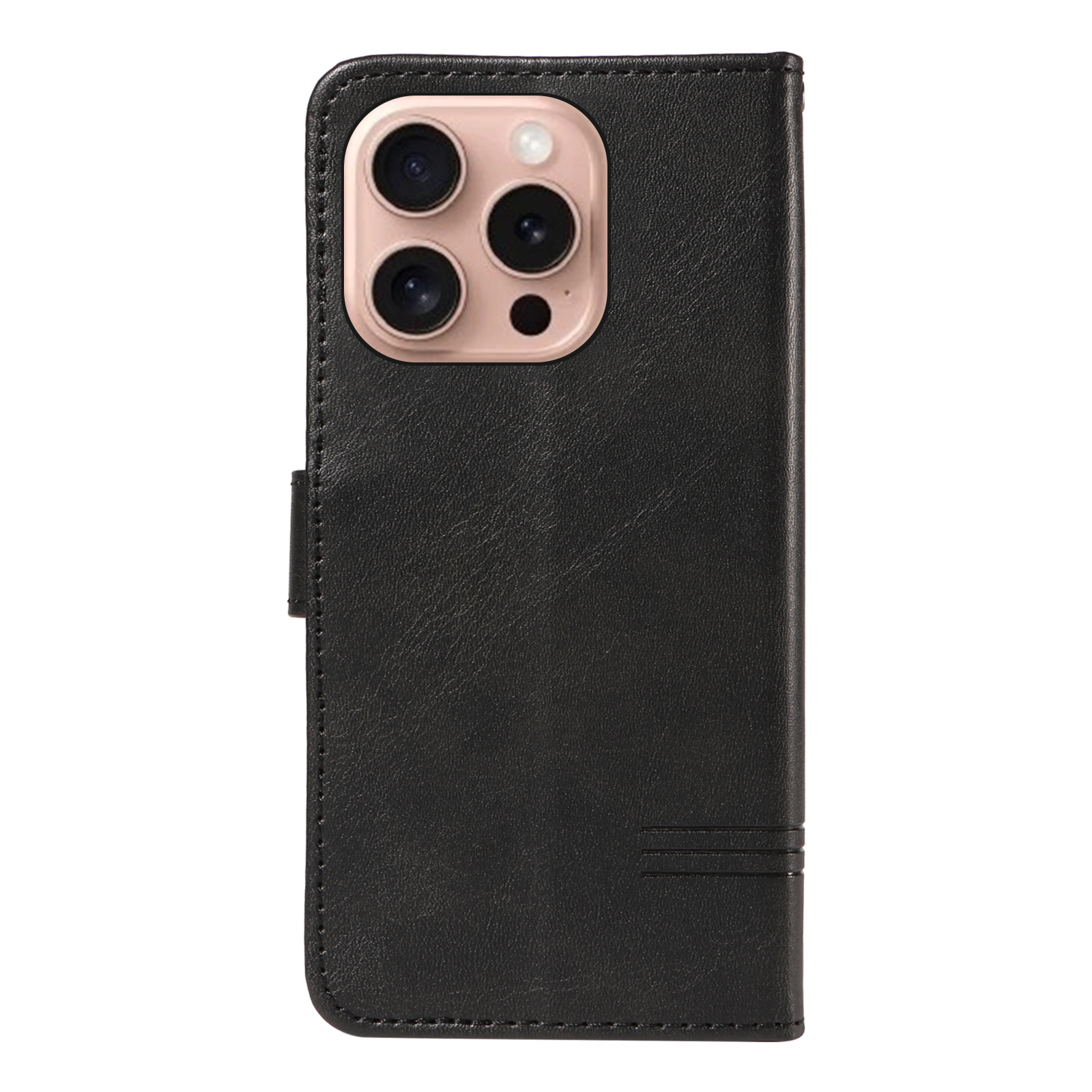 For iPhone 16 Pro Wallet Case T-Shape Lines Leather Phone Cover Stand – Black
