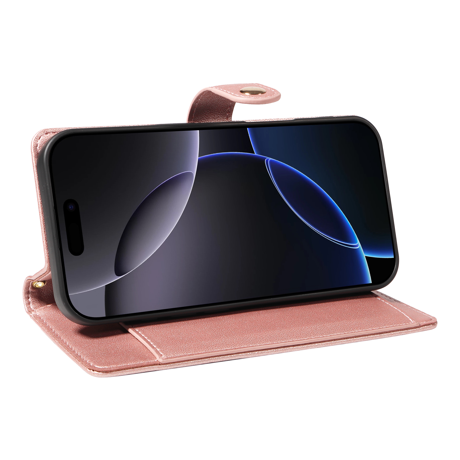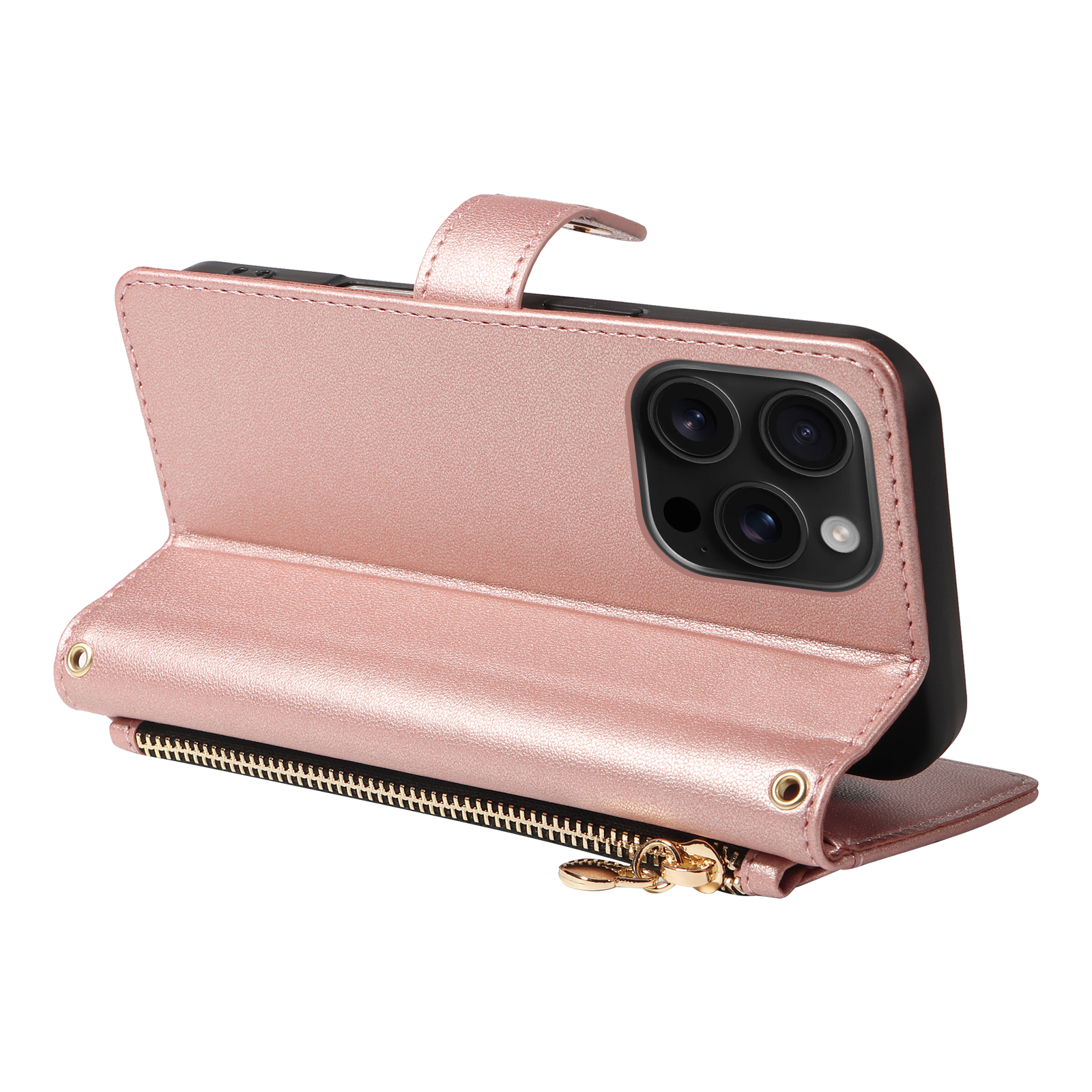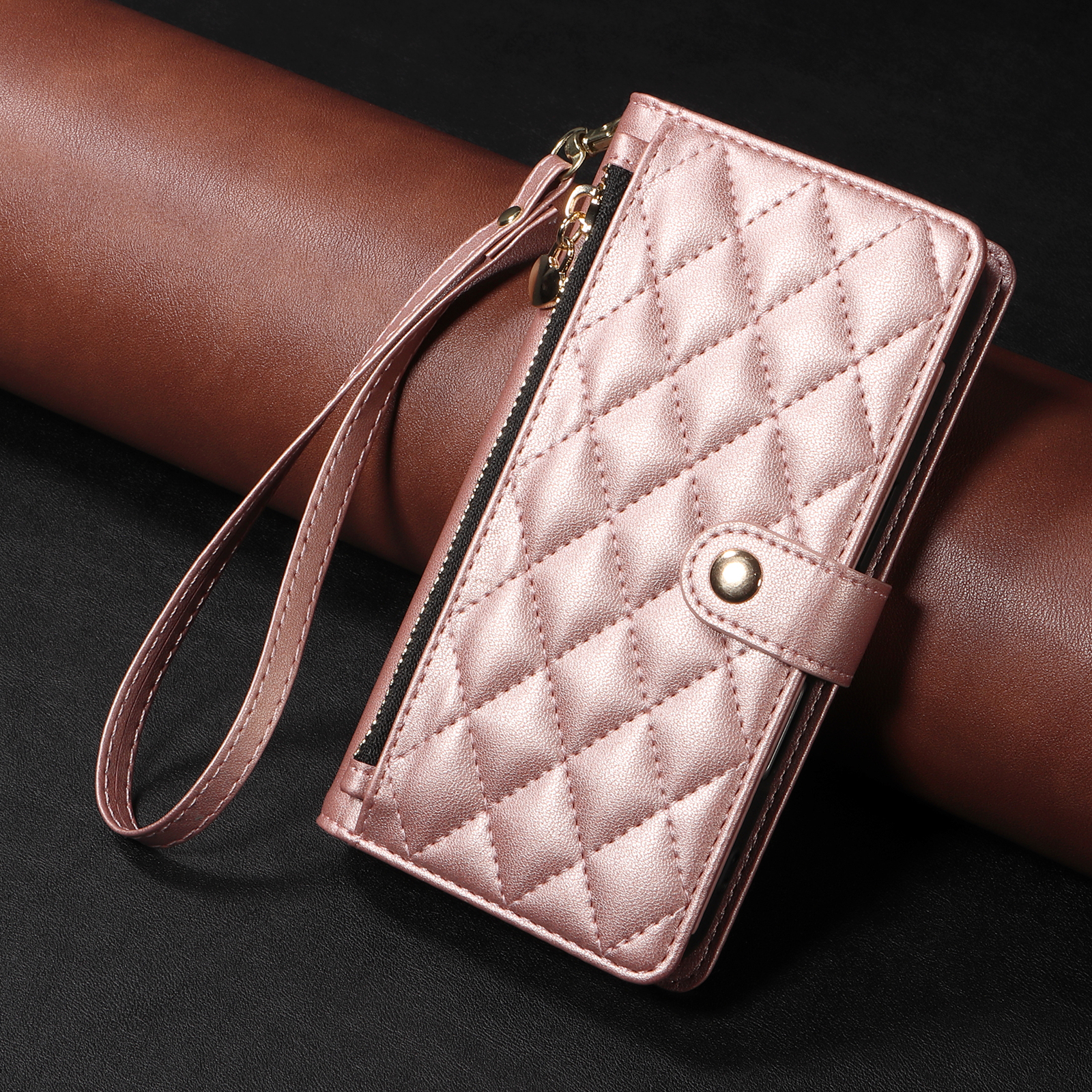 For iPhone 16 Pro Wallet Case with Straps, Rhombus Leather Stand Phone Cover – Rose Gold
