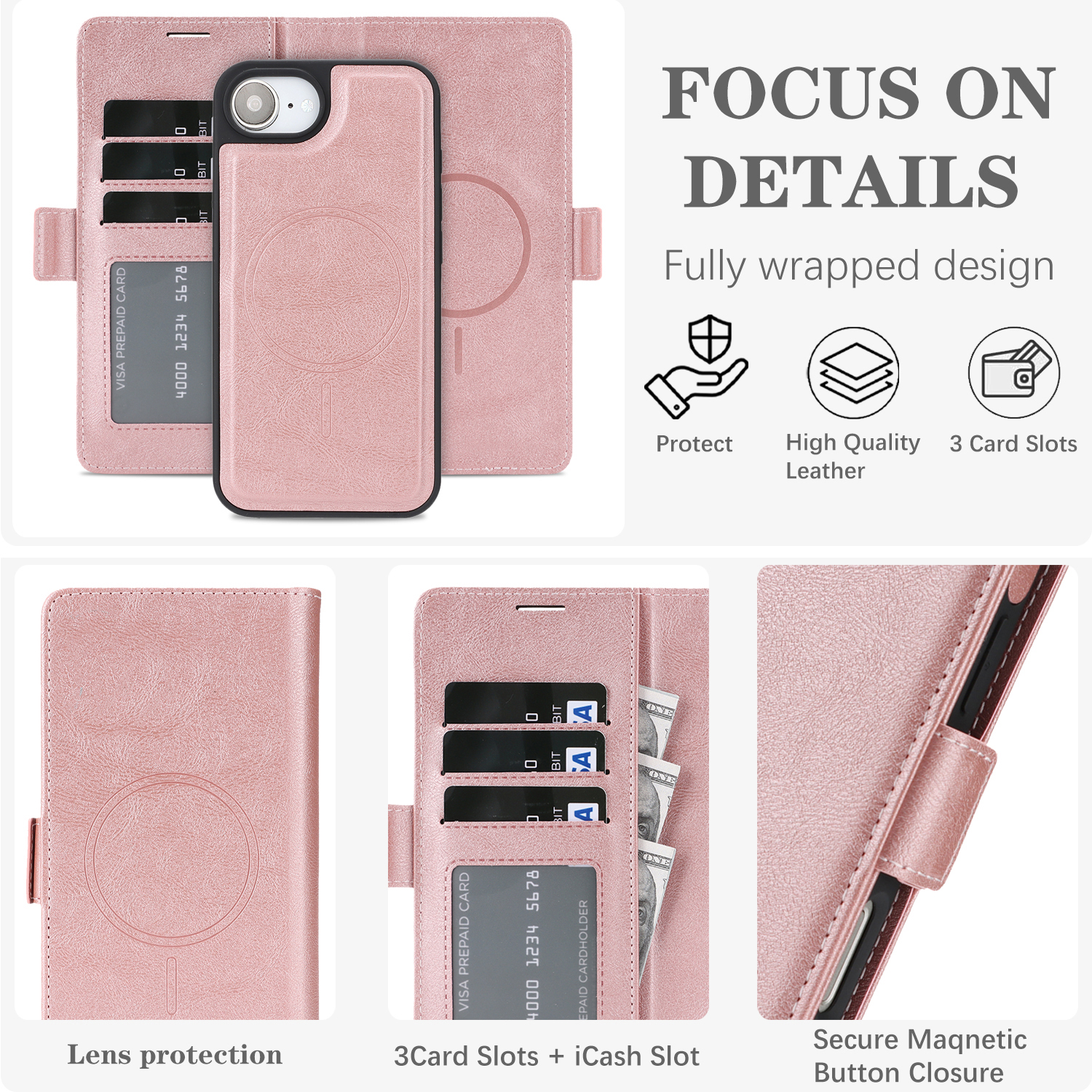 For iPhone 16e Case Detachable 2 in 1 Leather Wallet Phone Cover Compatible with MagSafe – Pink