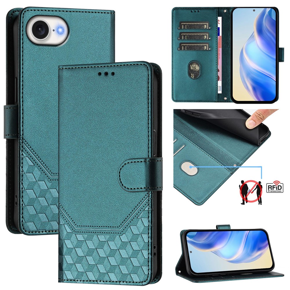 For iPhone 16e Case Imprinted Honeycomb RFID Blocking Leather Phone Cover with Strap – Green