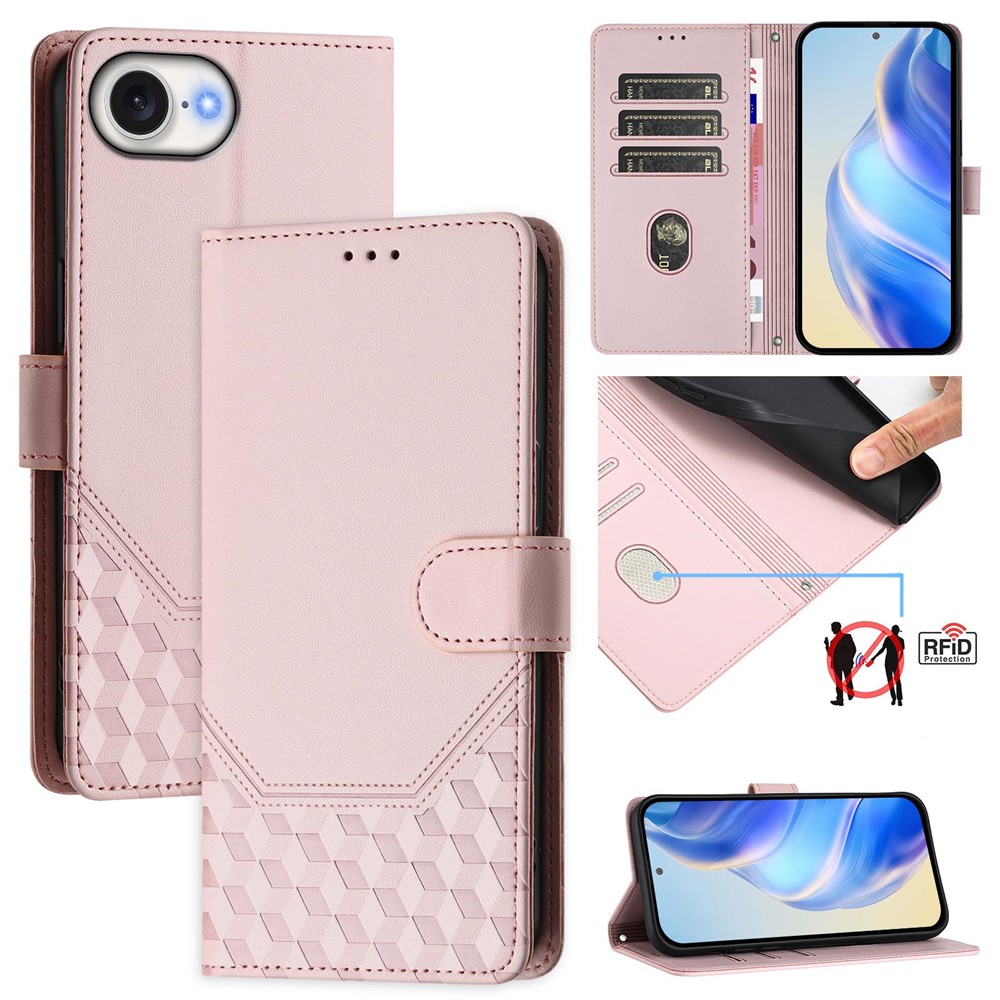 For iPhone 16e Case Imprinted Honeycomb RFID Blocking Leather Phone Cover with Strap – Pink