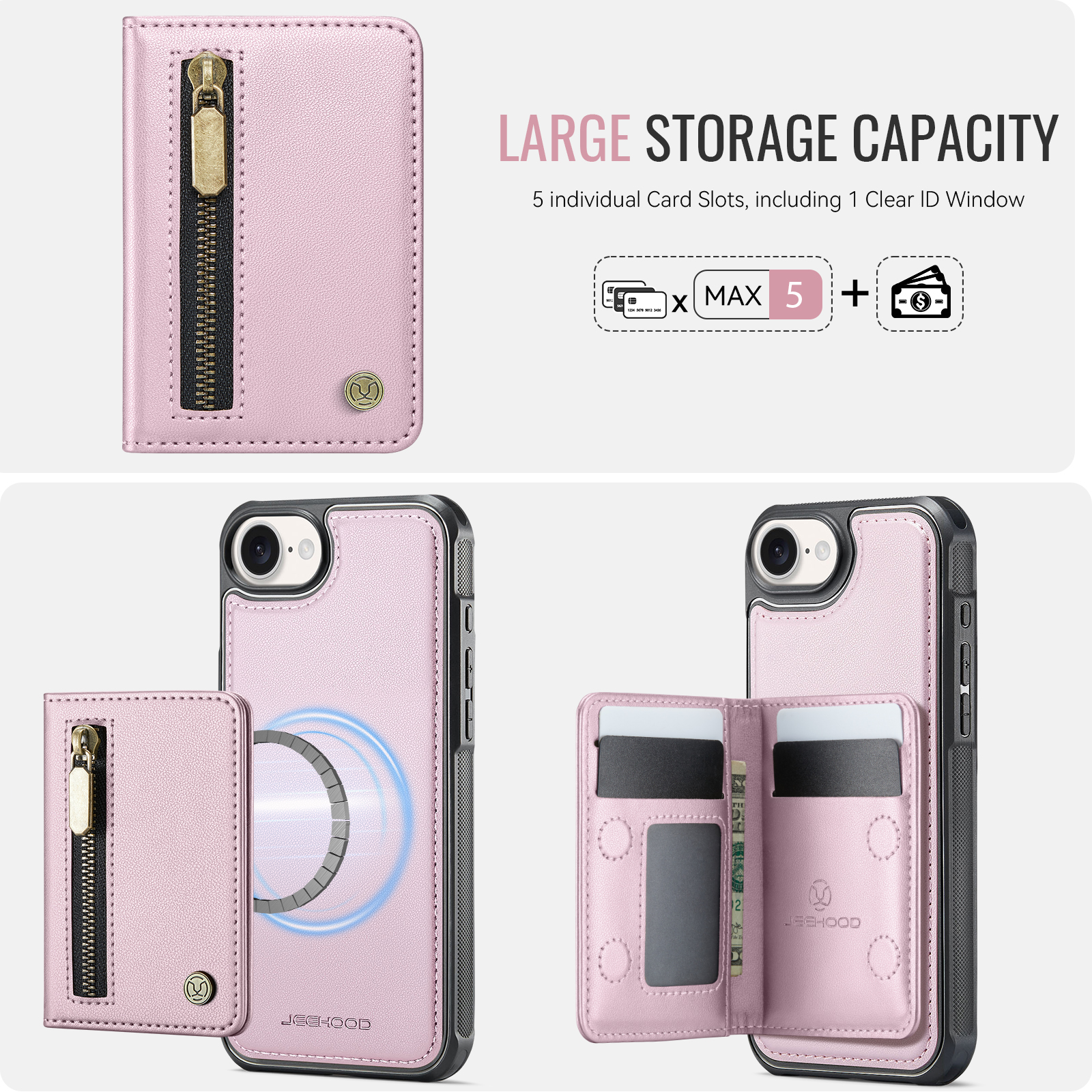- Versatile Storage Features 1 zipper pocket on the front, 1 photo slot, 3 card slots, and a cash slot inside for maximum organization.