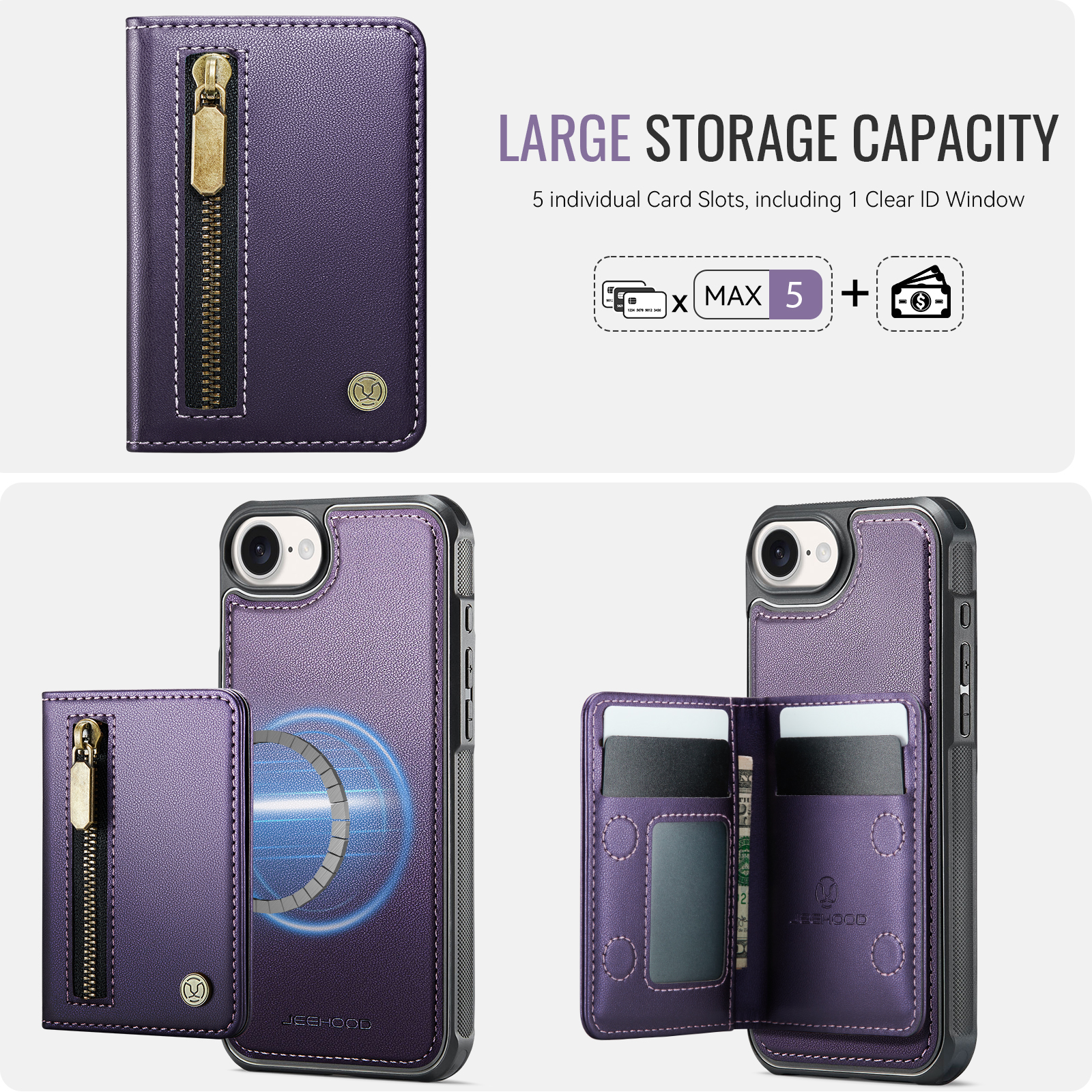 - Versatile Storage Features 1 zipper pocket on the front, 1 photo slot, 3 card slots, and a cash slot inside for maximum organization.