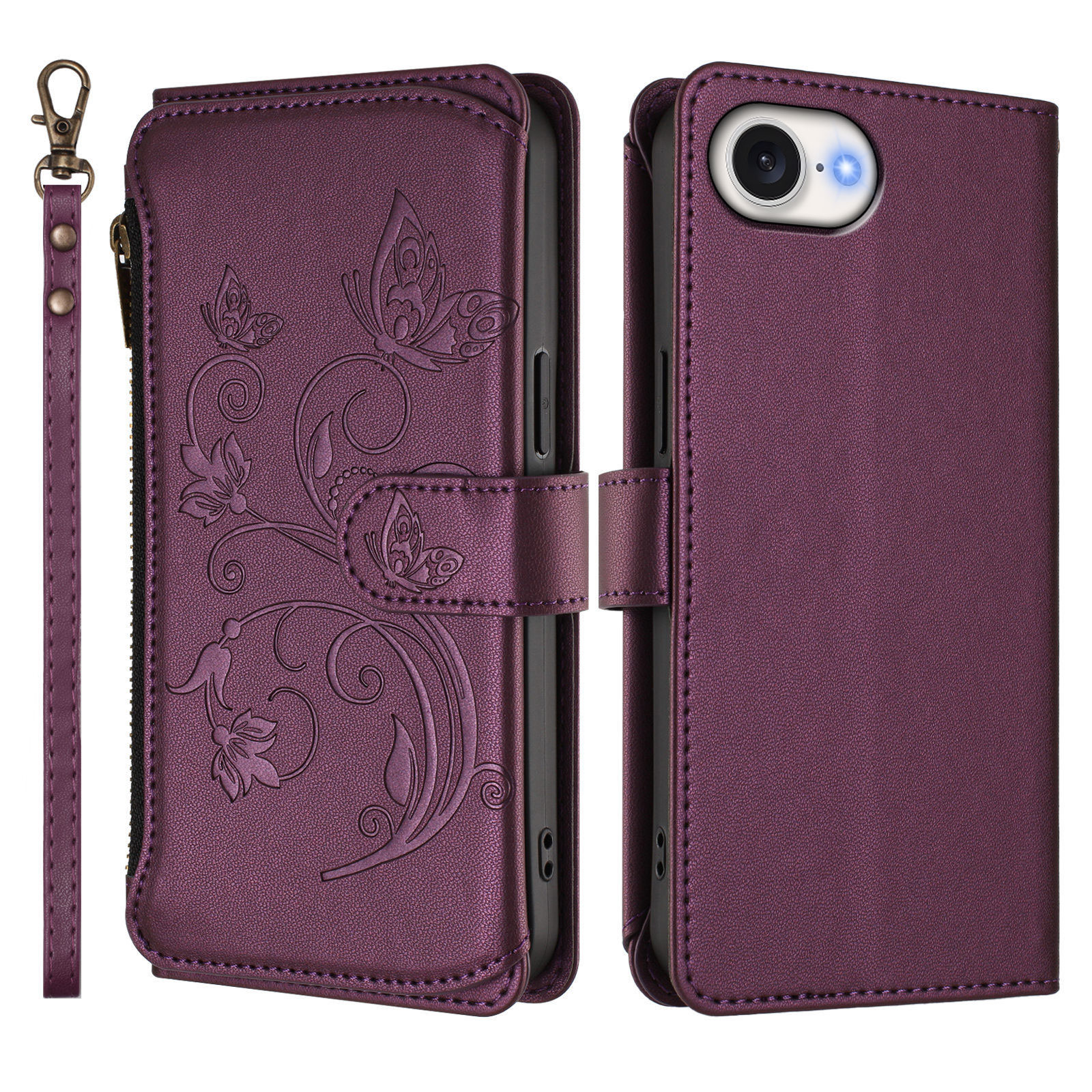 For iPhone 16e Leather Case Butterfly Floral Imprint Zipper Wallet Stand Cover with Wrist Strap - Purple $19.21