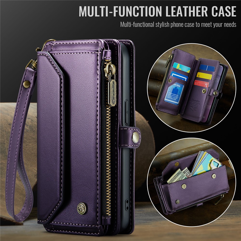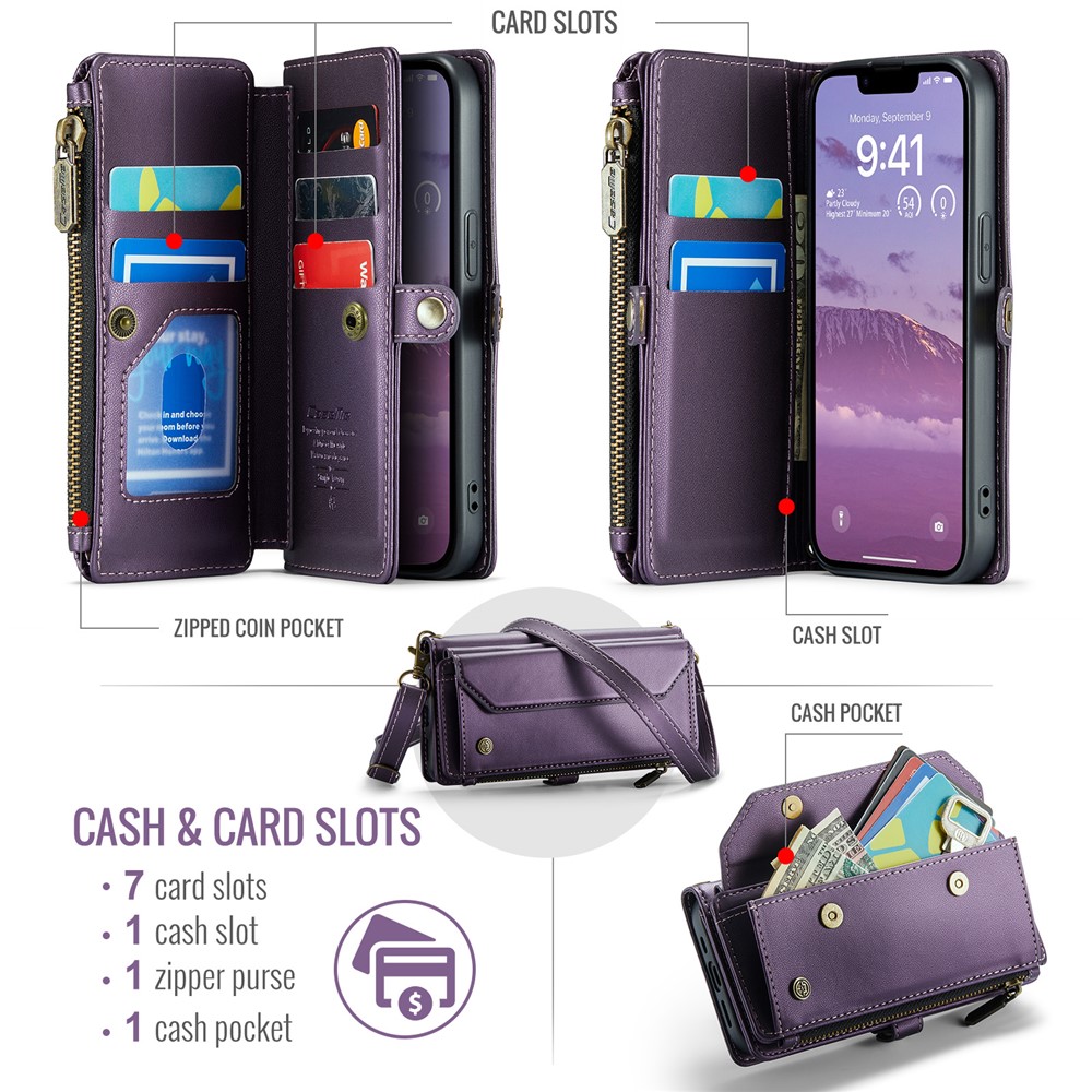 For iPhone 16e Leather Case CASEME C36 Zipper Multiple Card Slots Phone Cover with Straps – Purple