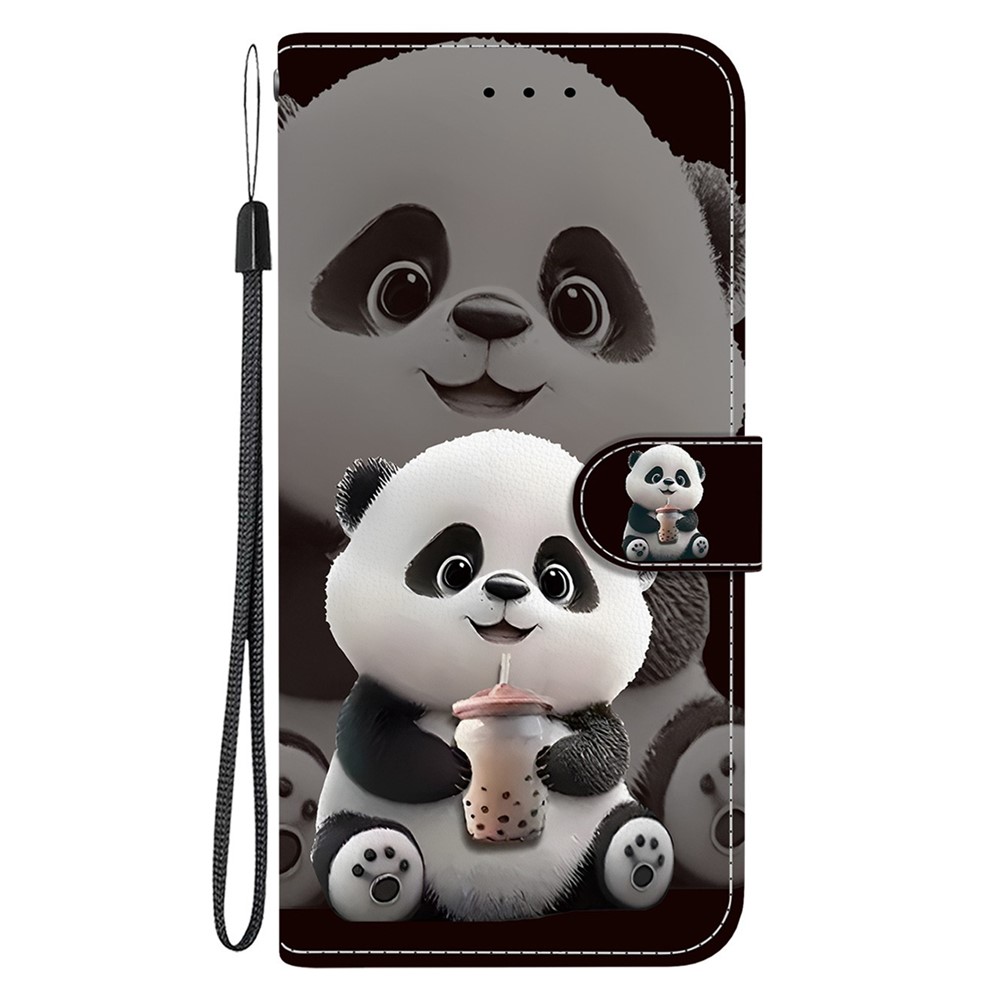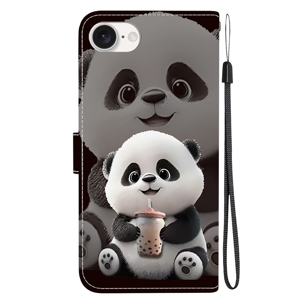 For iPhone 16e Leather Case Stand Wallet Pattern Printing Phone Cover with Wrist Strap - Milk Tea Panda $15.69