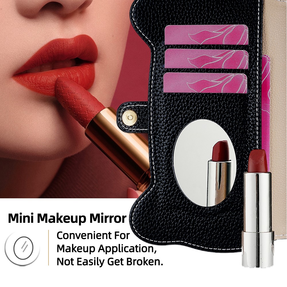 - Multi-Functional Storage Features 3 card slots, 1 cash slot, 1 oval stainless steel makeup mirror, and a large-capacity zipper wallet for cash/coins.