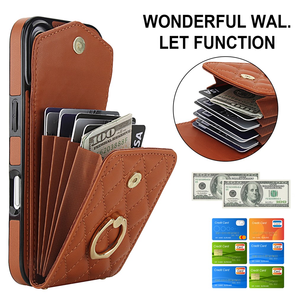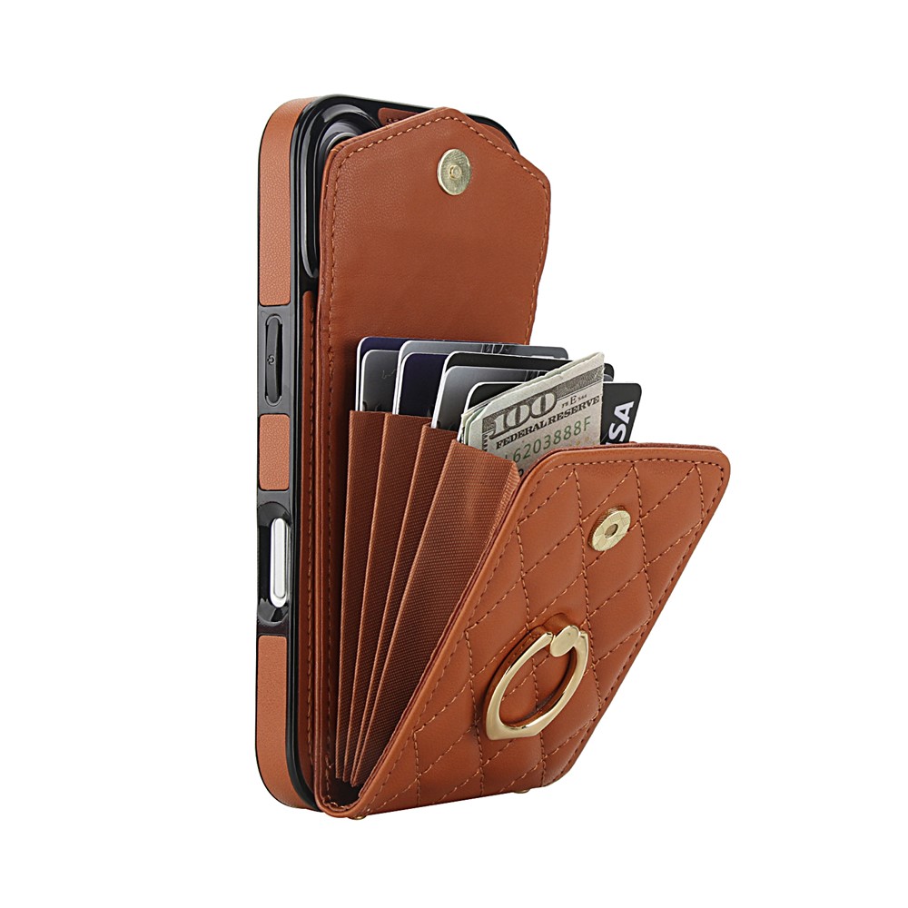 - Accordion-Style Card Holder The back of the case features an accordion-style cardholder with a magnetic button closure, perfect for storing essential cards and cash securely
