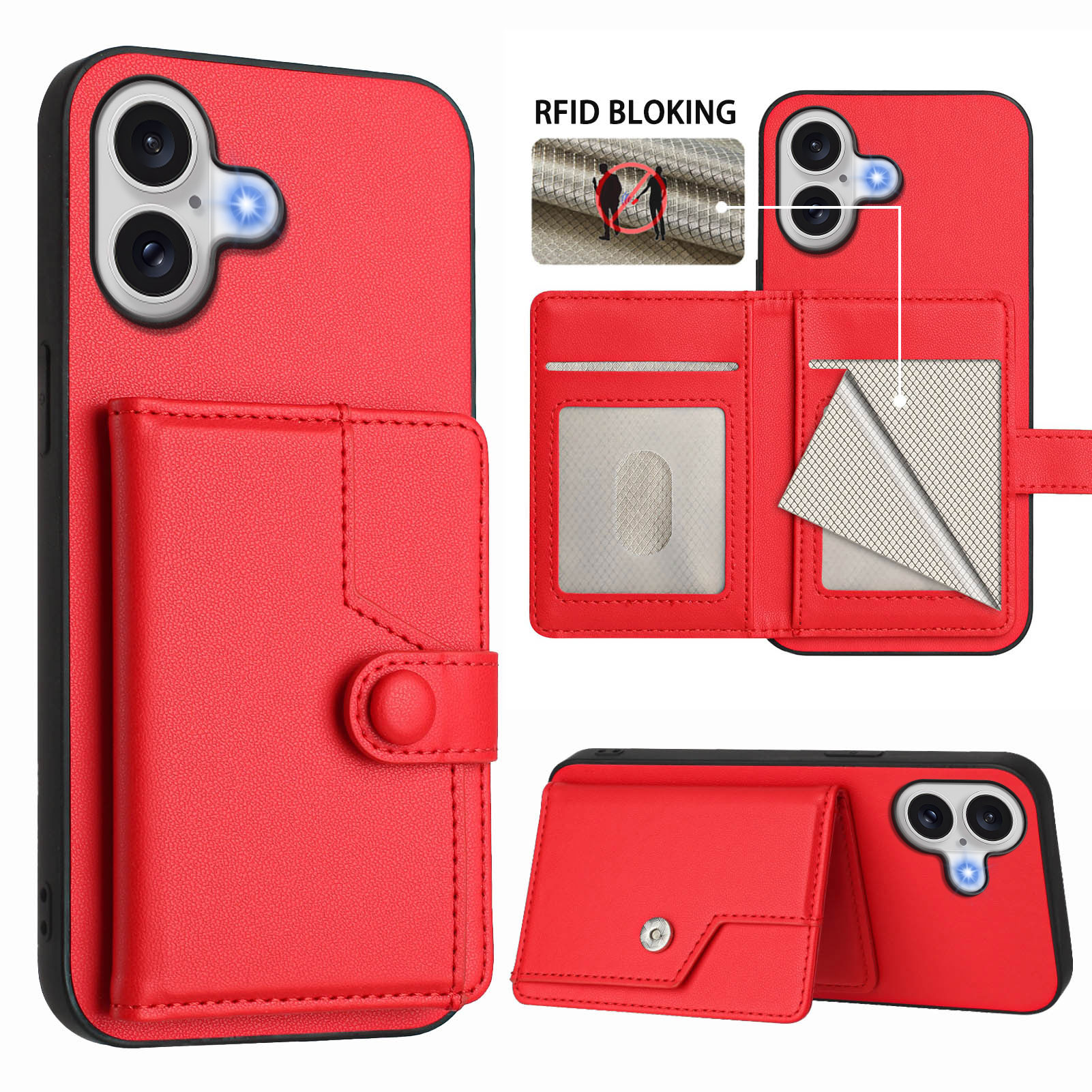 For iPhone 17 Case RFID Blocking Card Holder Kickstand TPU + PU Leather Phone Back Cover – Red