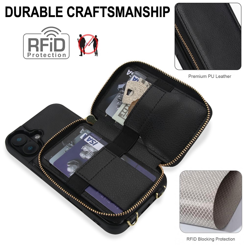 For iPhone 17 Case RFID Blocking Zipper Wallet Leather + TPU Phone Cover with Shoulder Strap – Black