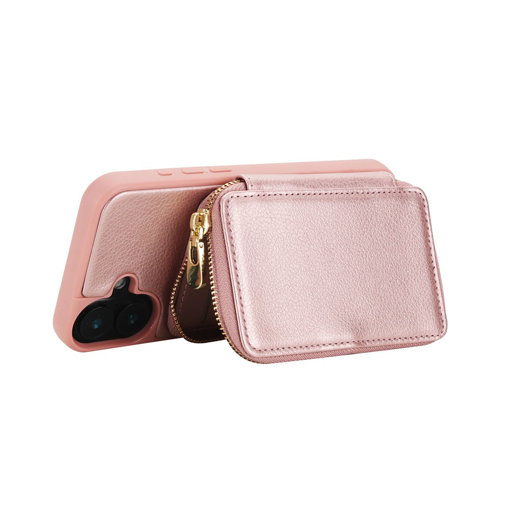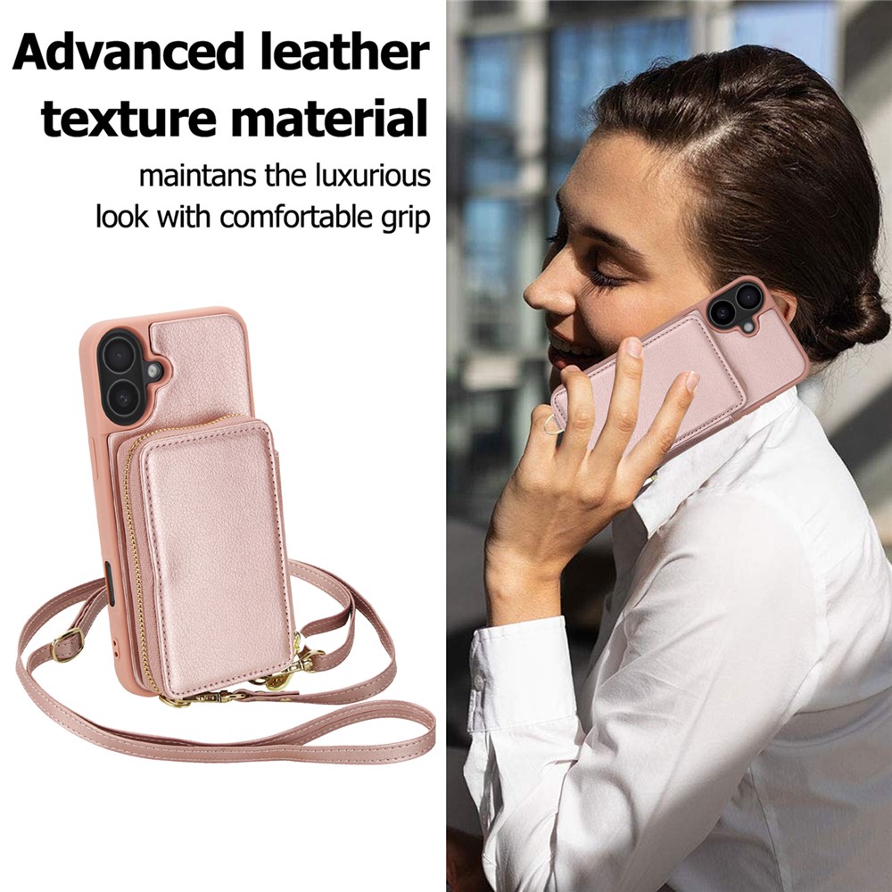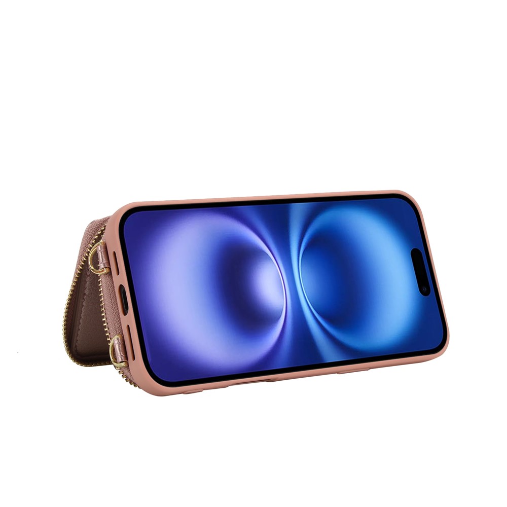 For iPhone 17 Case RFID Blocking Zipper Wallet Leather + TPU Phone Cover with Shoulder Strap - Rose Gold $21.69