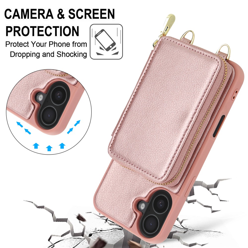 For iPhone 17 Case RFID Blocking Zipper Wallet Leather + TPU Phone Cover with Shoulder Strap – Rose Gold