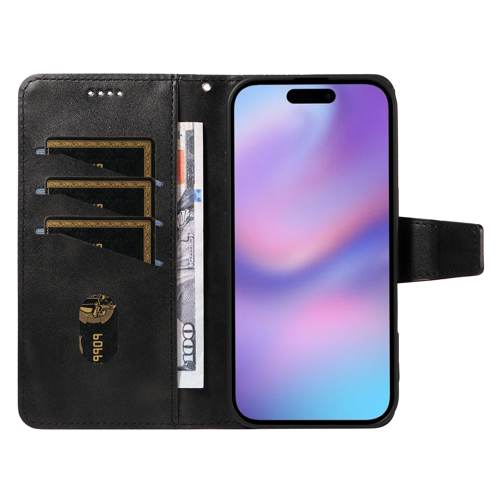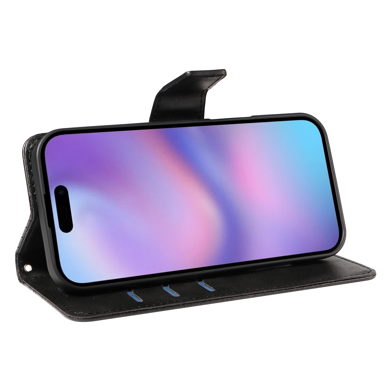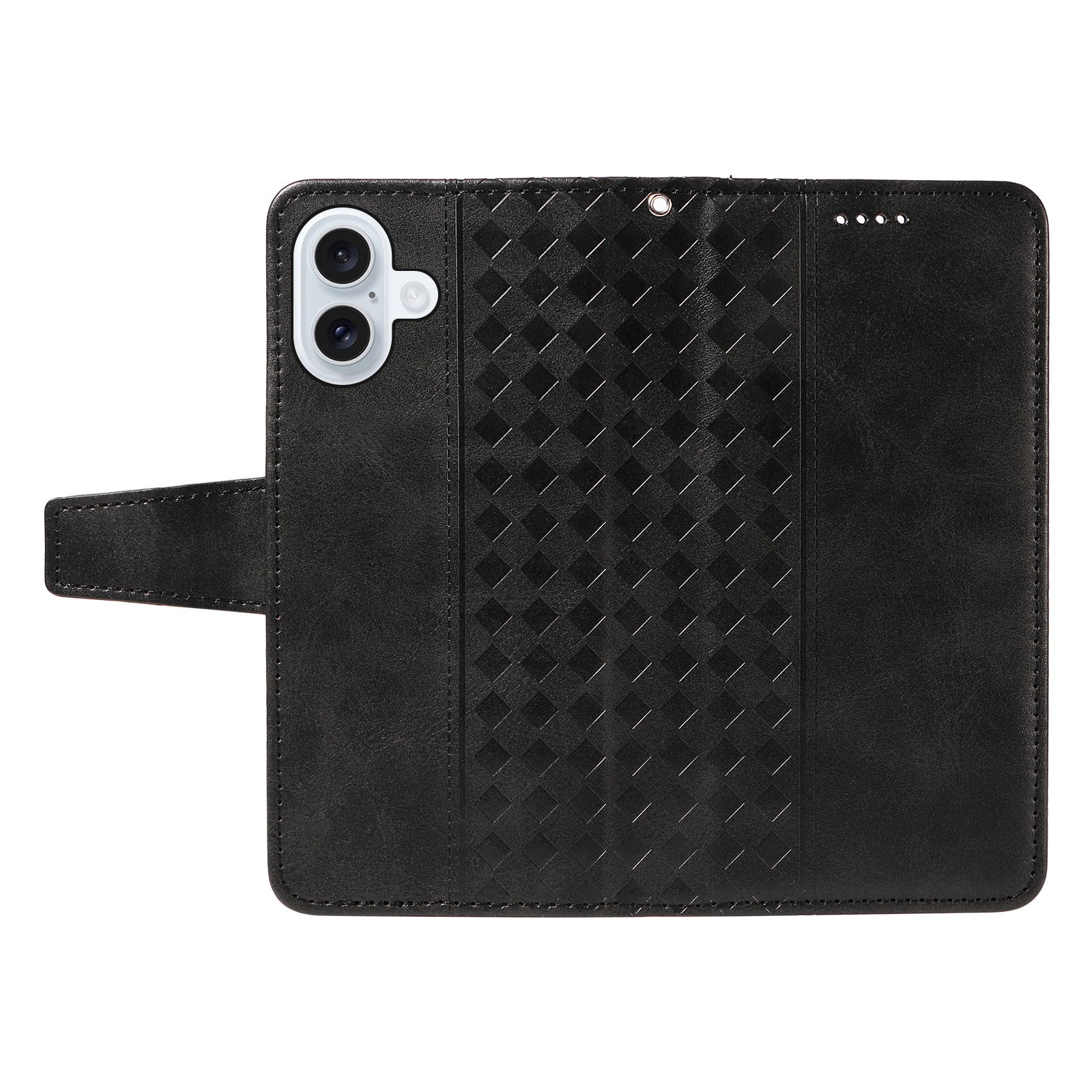 For iPhone 17 Leather Case Wallet Stand Grids Imprinted Phone Cover with Strap – Black