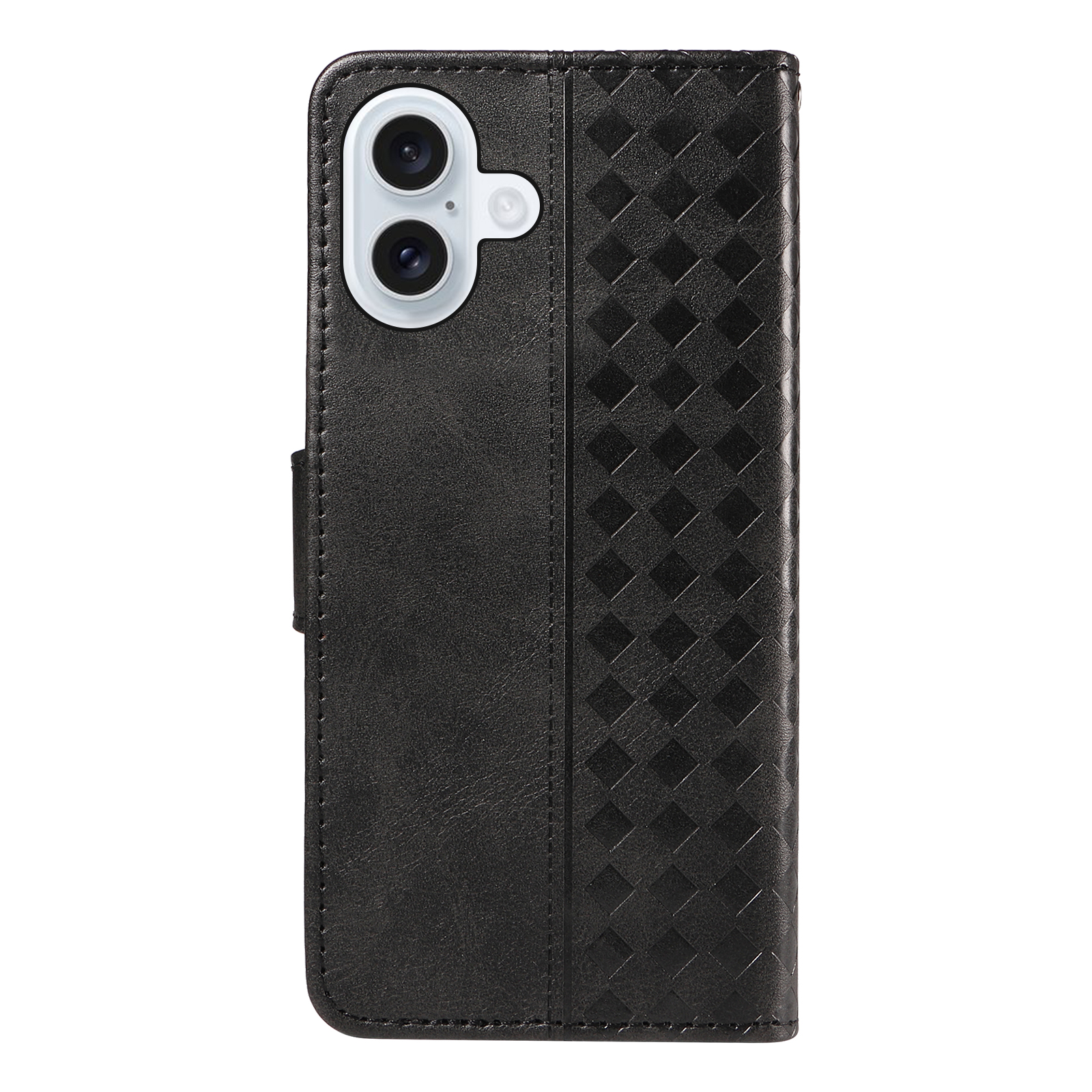 For iPhone 17 Leather Case Wallet Stand Grids Imprinted Phone Cover with Strap - Black