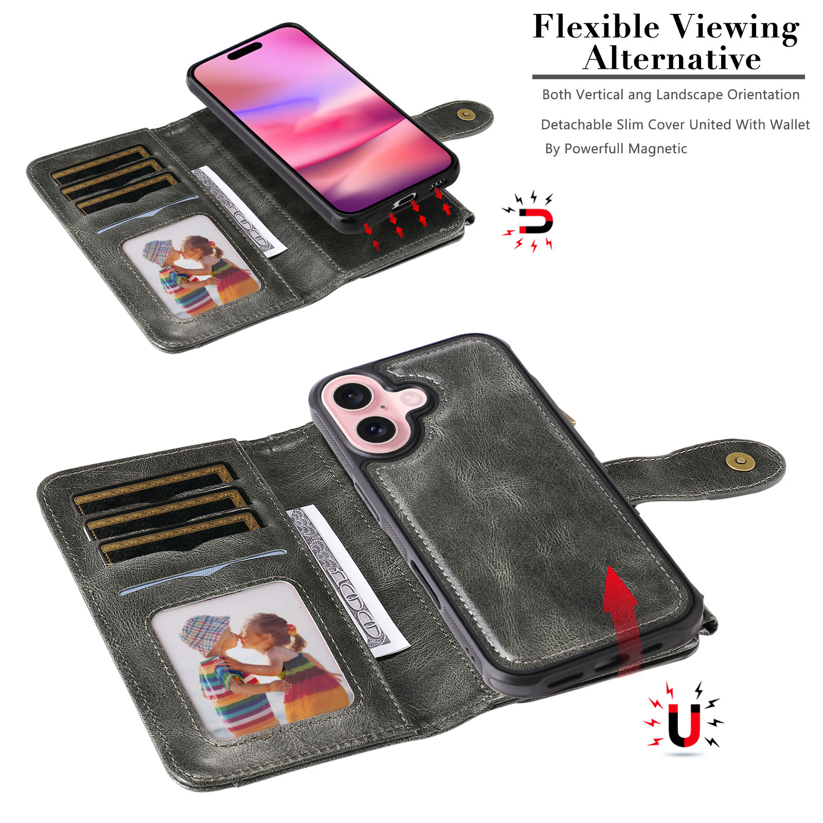 - Detachable 2-in-1 Design The phone case features a detachable 2-in-1 design with magnetic absorption, allowing the inner TPU case—lined with premium leather—to be used separately for a sleek and protective standalone look.