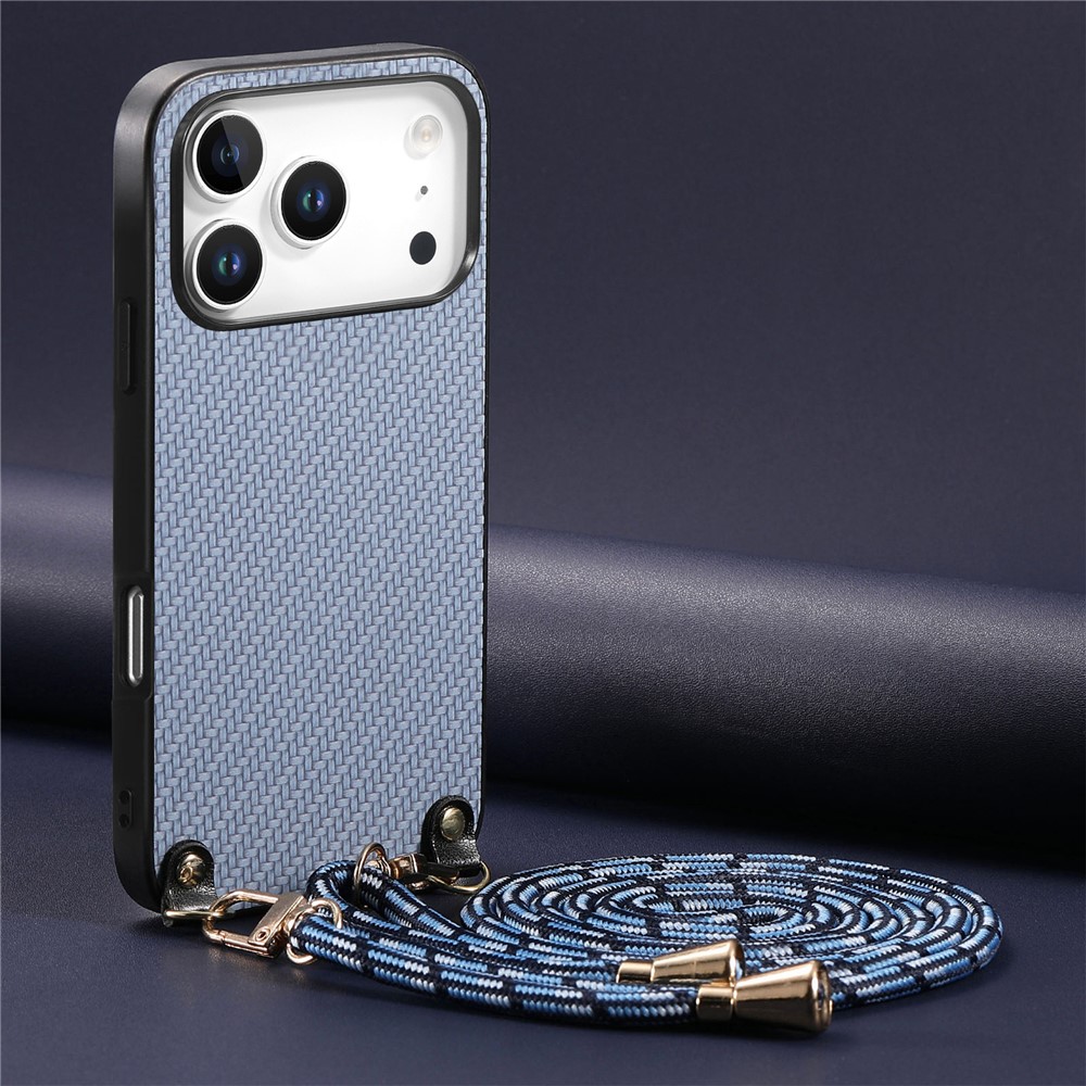 For iPhone 17 Pro Case Carbon Fiber Texture Hybrid Phone Back Cover with Adjustable Strap – Blue