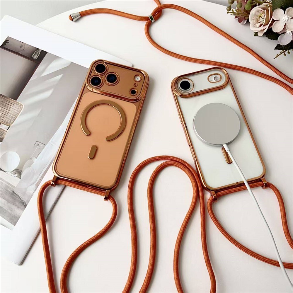 For iPhone 17 Pro Case Compatible with MagSafe Electroplating Edge TPU Phone Cover with Screen Film / Shoulder Strap – Orange
