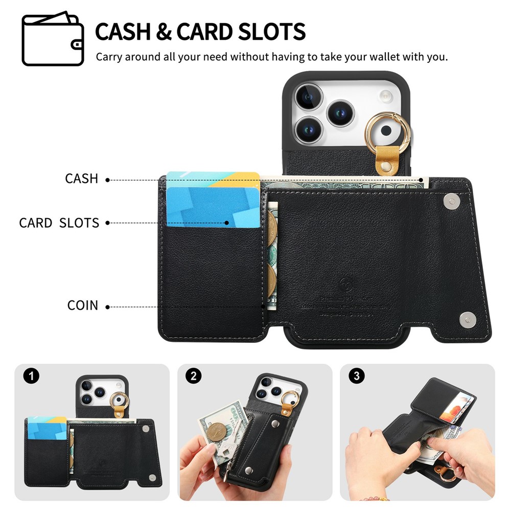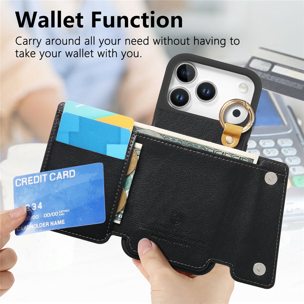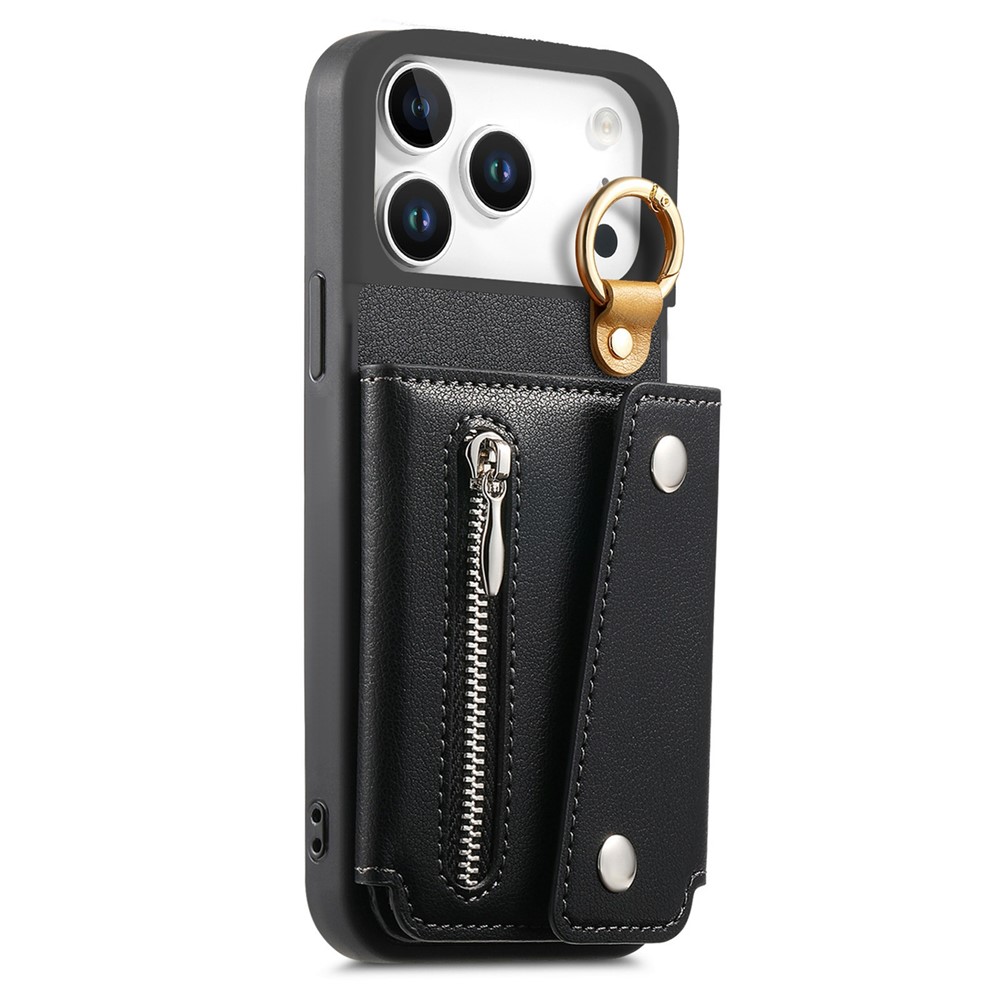 For iPhone 17 Pro Case D-Ring Holder Leather + PC + TPU Phone Cover with Wallet Kickstand – Black