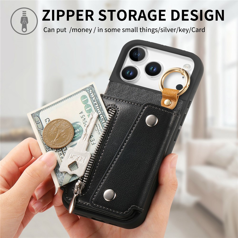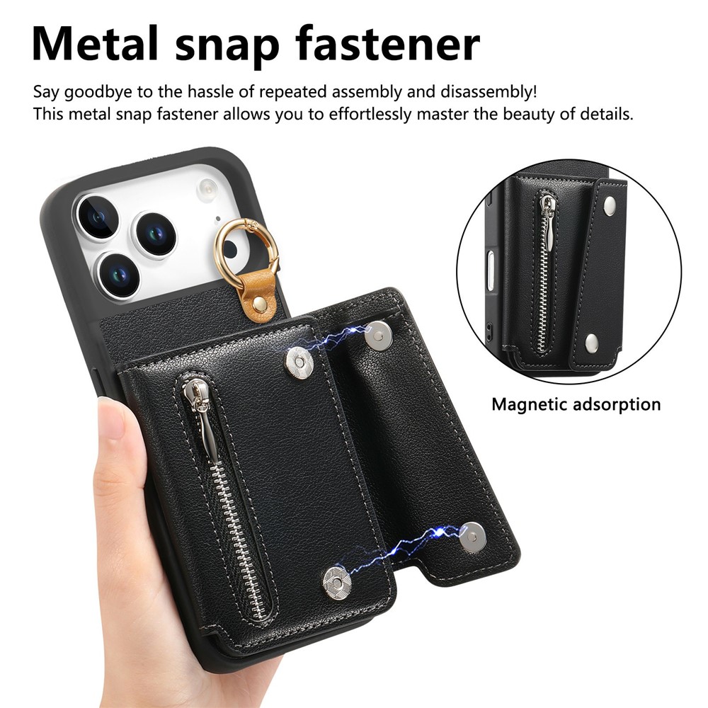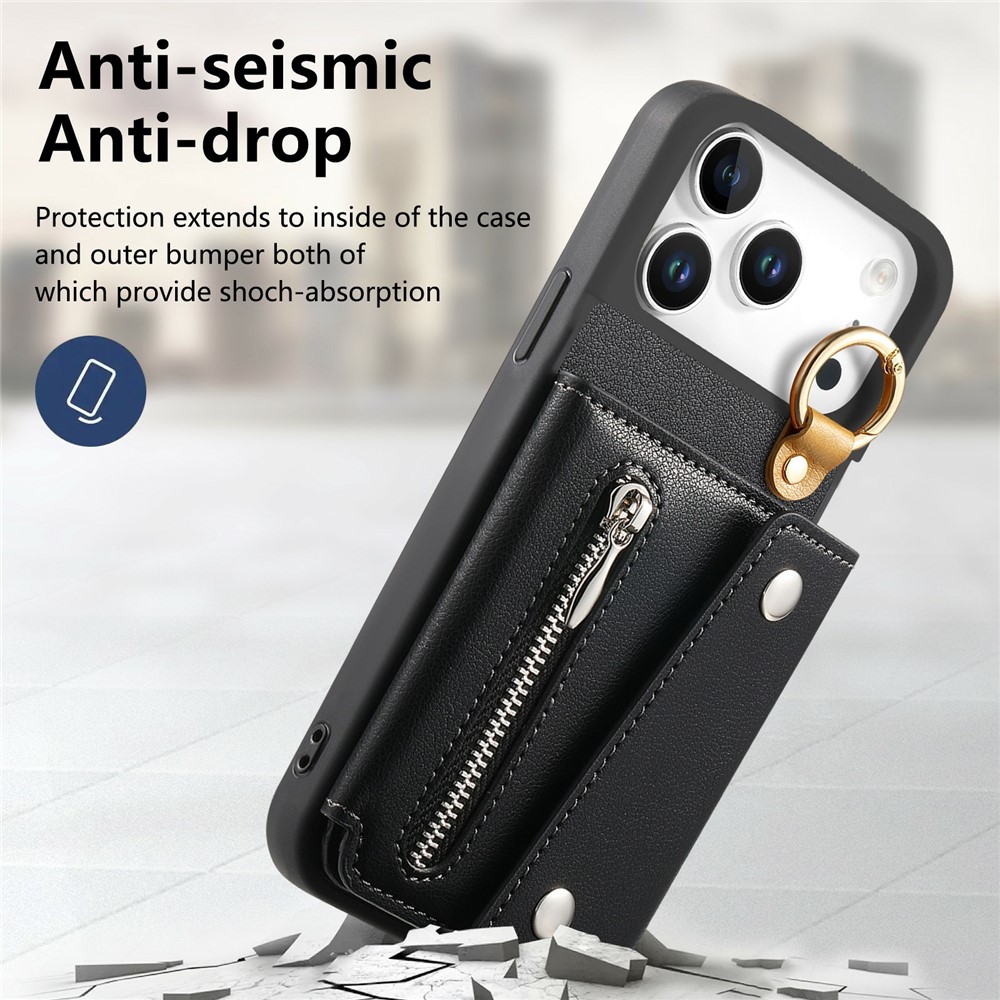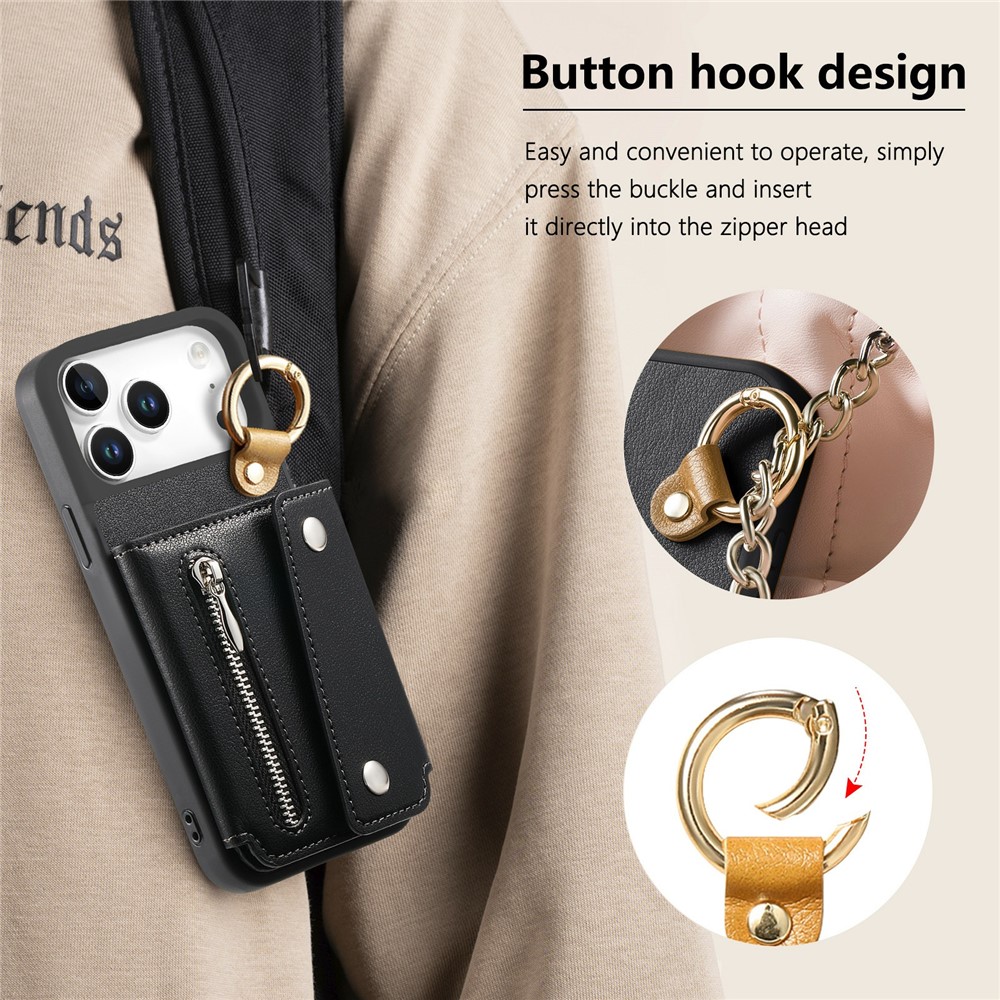 For iPhone 17 Pro Case D-Ring Holder Leather + PC + TPU Phone Cover with Wallet Kickstand – Black
