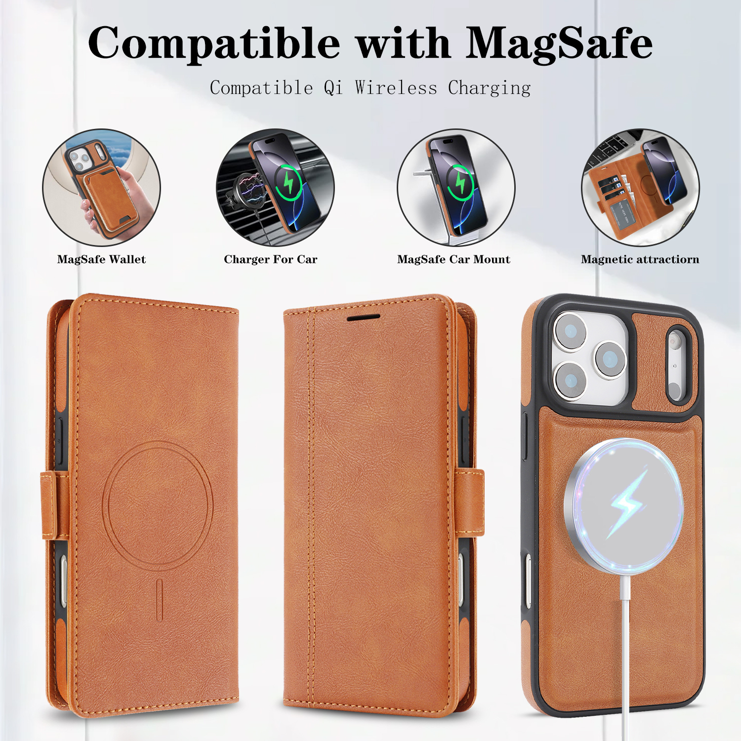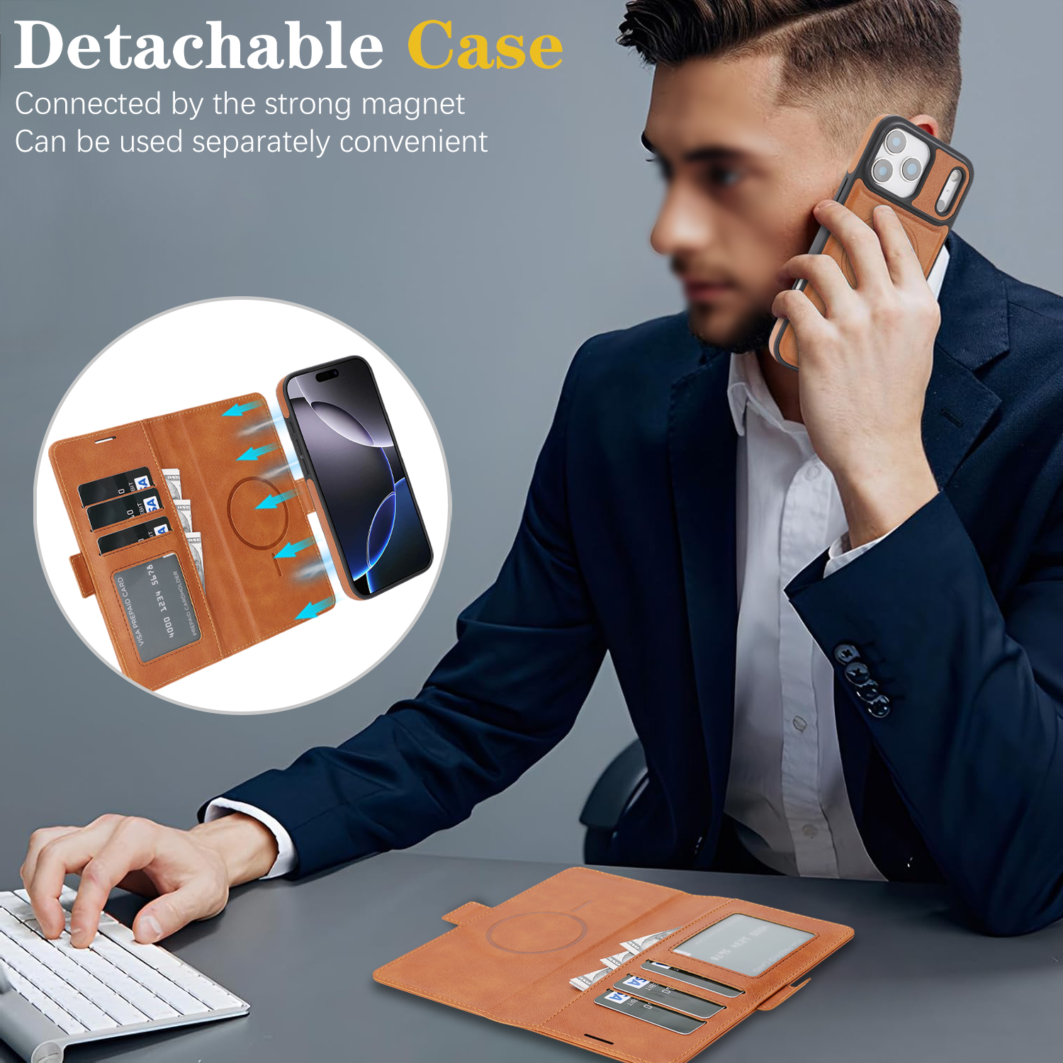 For iPhone 17 Pro Case Detachable 2 in 1 Leather Wallet Phone Cover Compatible with MagSafe – Brown