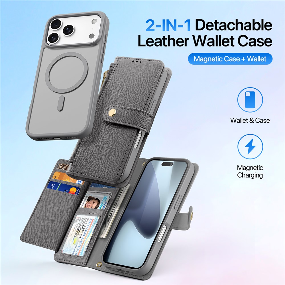 For iPhone 17 Pro Case DUX DUCIS Lawa Series Detachable Magnetic Cowhide Leather Cover Zipper Wallet – Grey