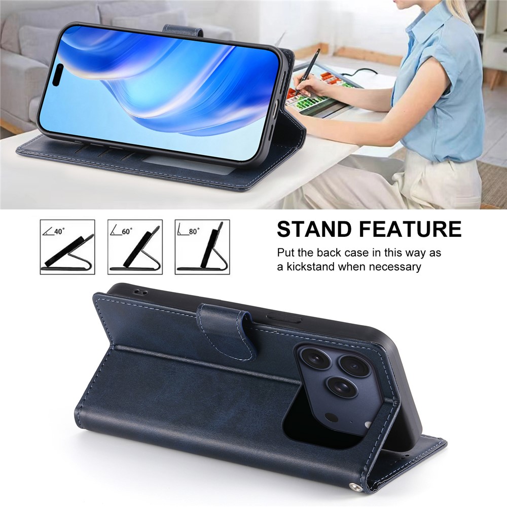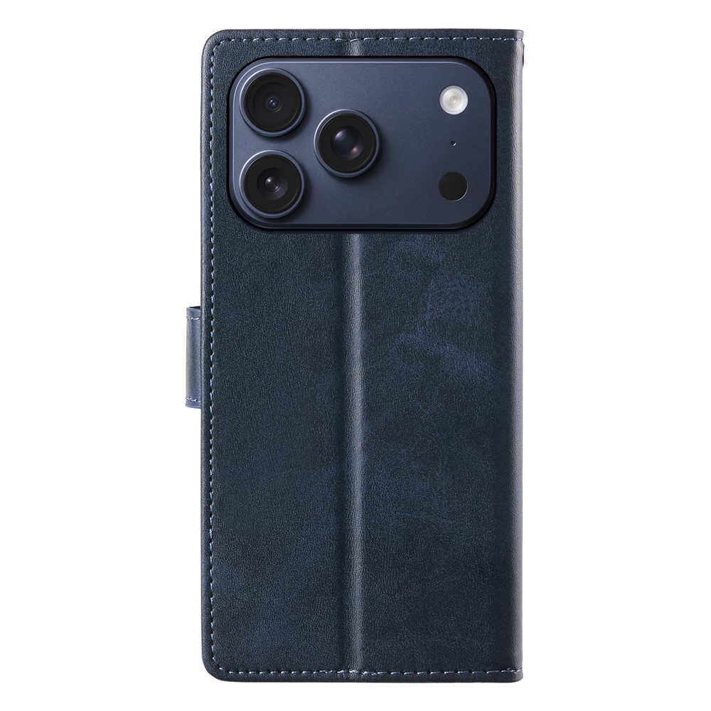 For iPhone 17 Pro Case Stand Wallet Calf Texture PU Leather Flip Phone Cover with Wrist Strap - Blue