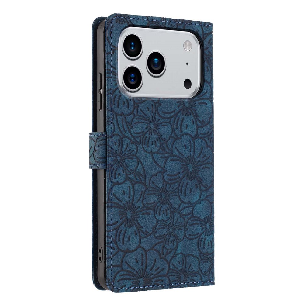 For iPhone 17 Pro Flip Case Cherry Blossom Pattern Leather Wallet Stand Phone Cover with Wrist Strap – Blue