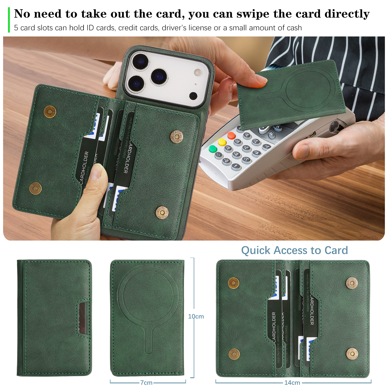 - MagSafe Compatible Supports for MagSafe accessories and wireless charging, featuring a minimalist magnetic leather bi-fold design with card holder functionality.