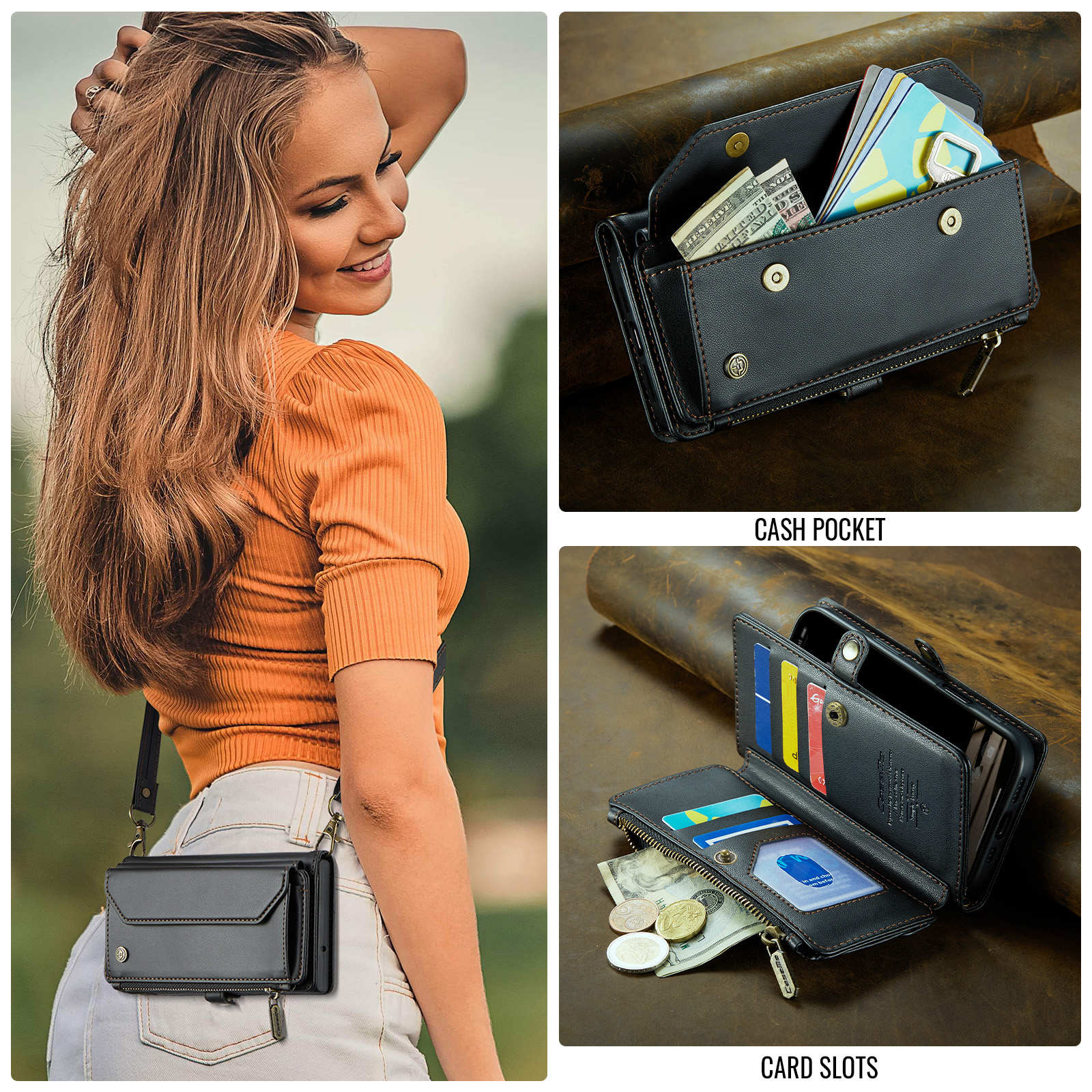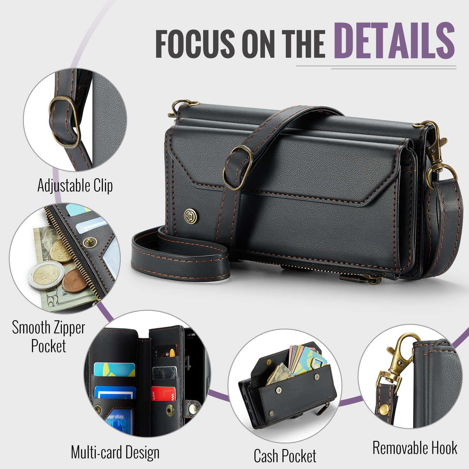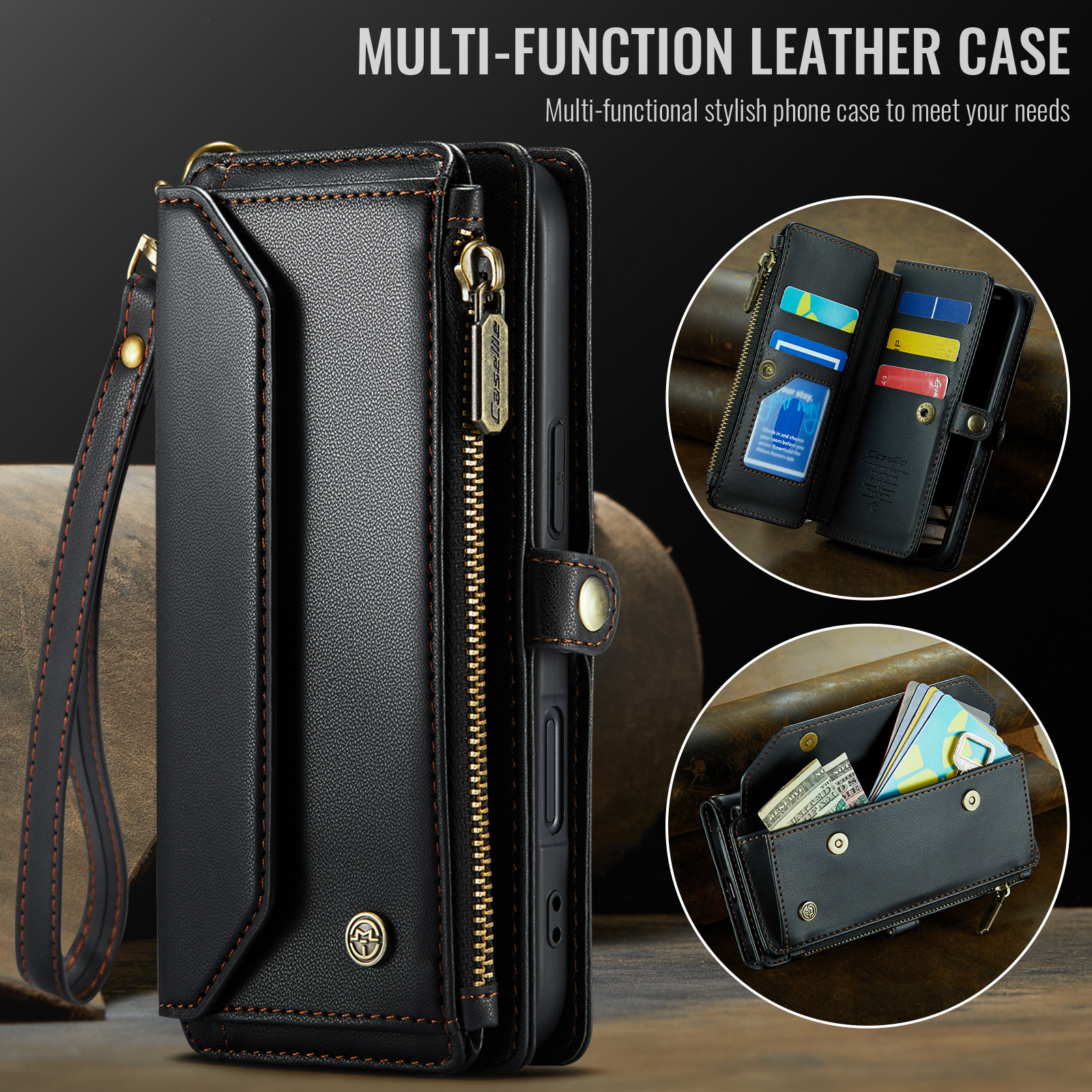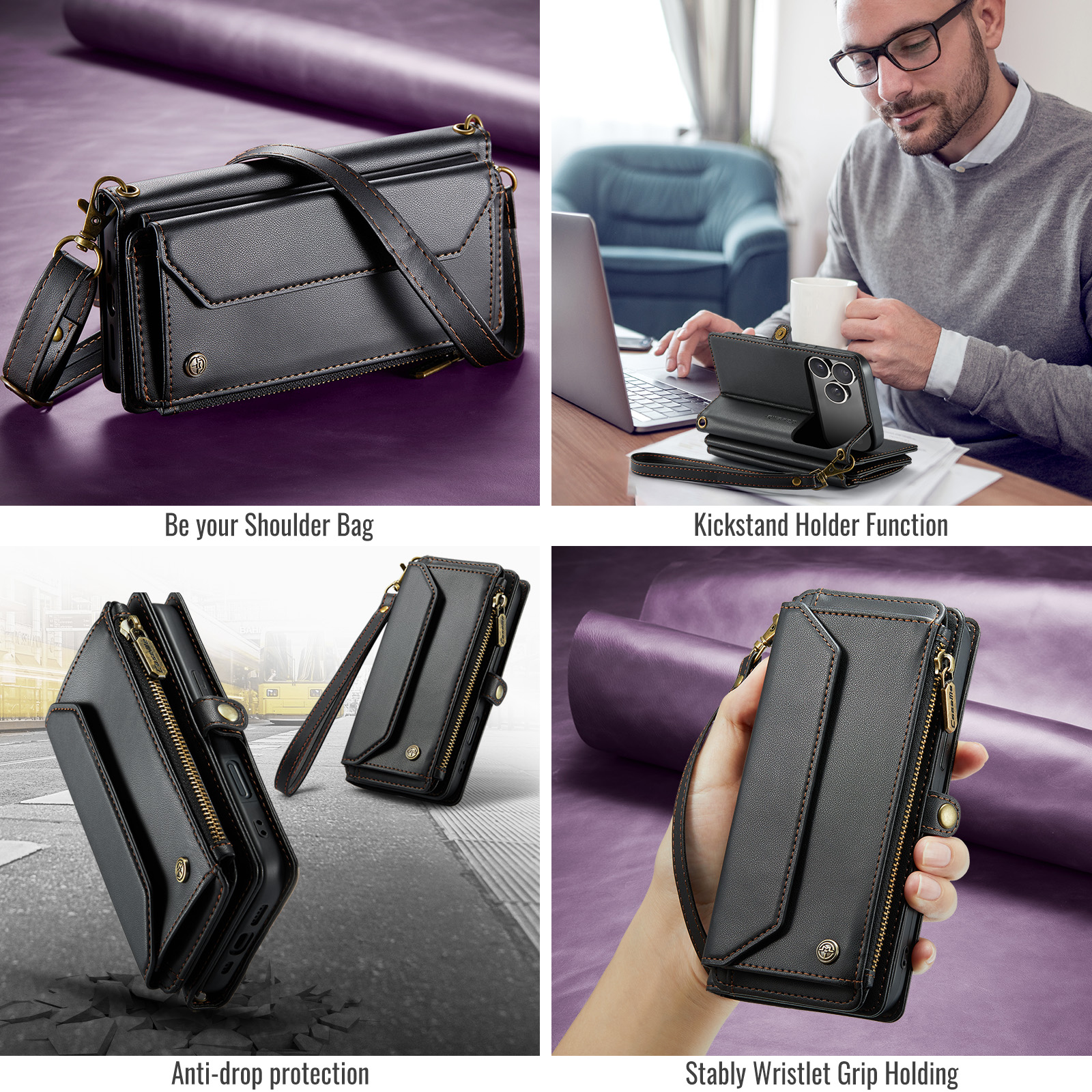 For iPhone 17 Pro Leather Case CASEME C36 Zipper 10 Card Slots Phone Cover with Straps – Black